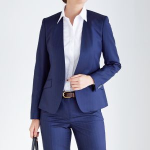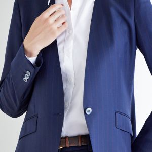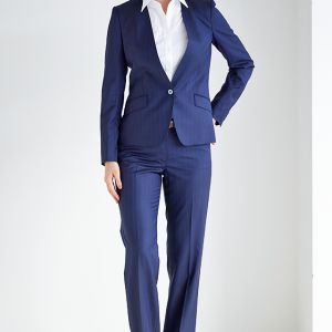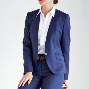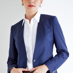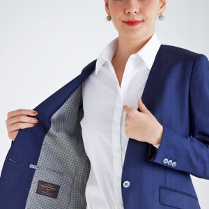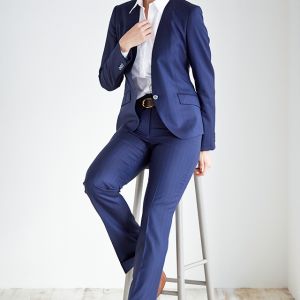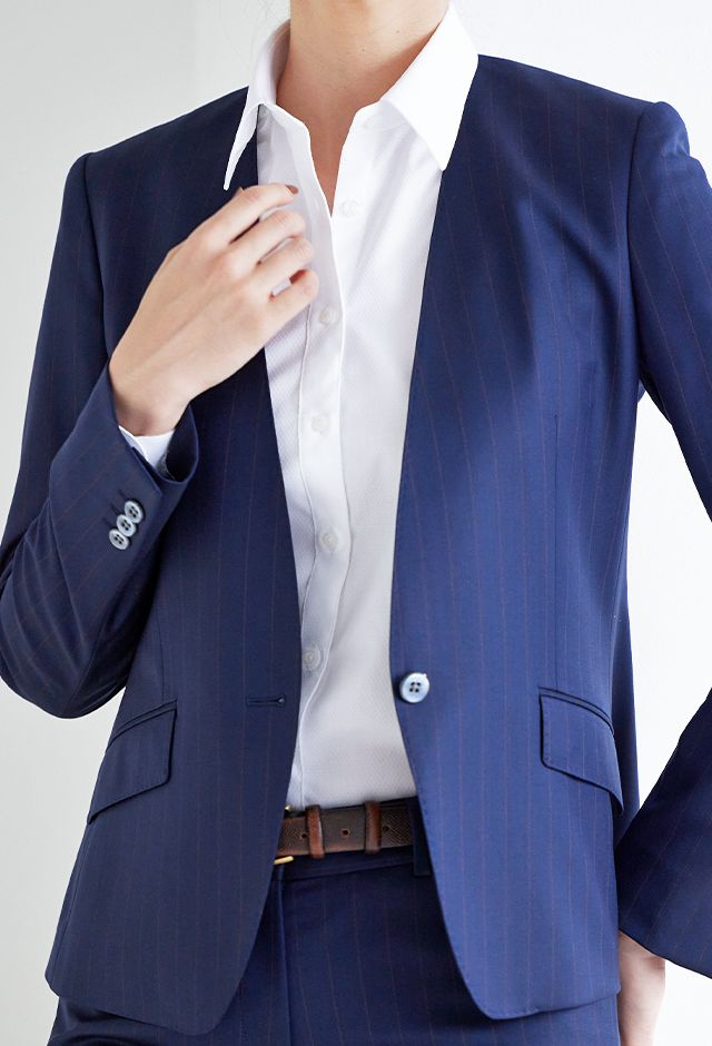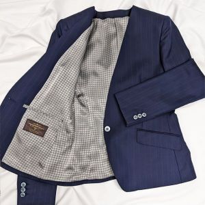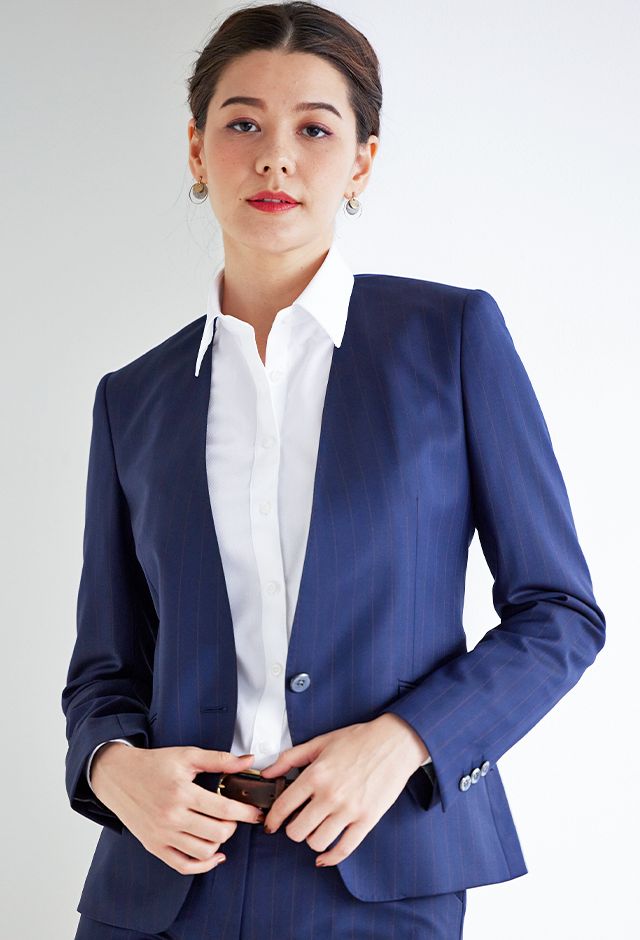 高品質でコストパフォーマンスに優れたイタリアブランド「カノニコ」で仕立てたスーツです。鮮やかなネイビーにレッドのストライプ柄のスタイルで、オールシーズン着用していただけます。ジャケットはノーカラーモデル(ホック)、ボトムスはクールなセミフレアパンツで仕立てました。裏地にはレディースで好評の千鳥格子をチョイス。ジャケットのポケットは斜めにすることでシャープな印象に。ホワイトのシャツと組み合わせた、ビジネスシーンにも最適なコーデです。※生地在庫は変動いたしますのでご了承くださいませ。