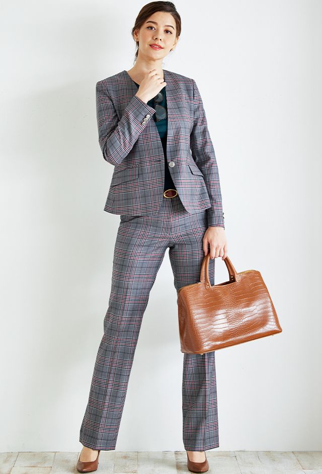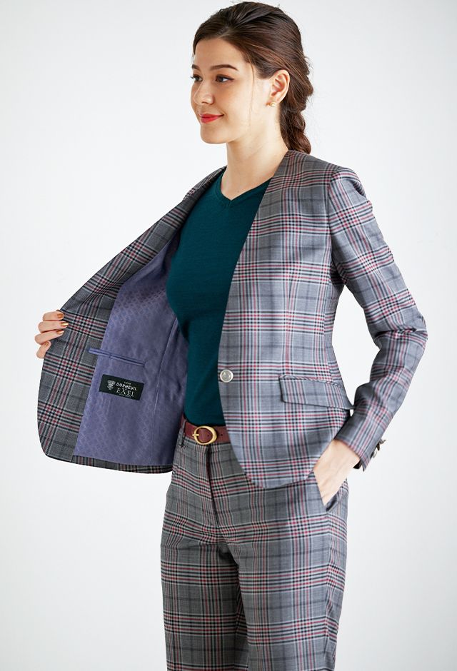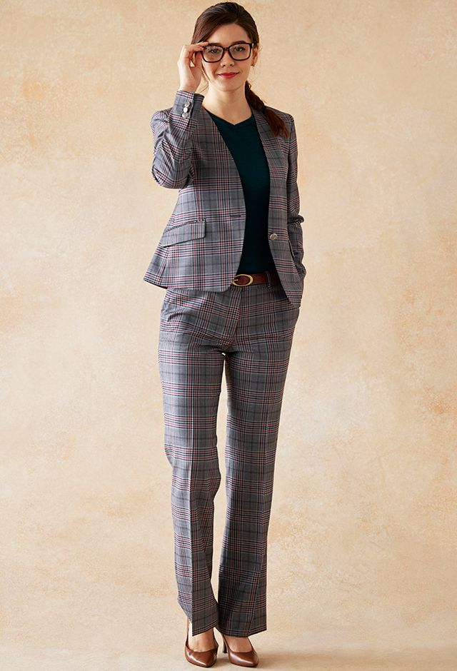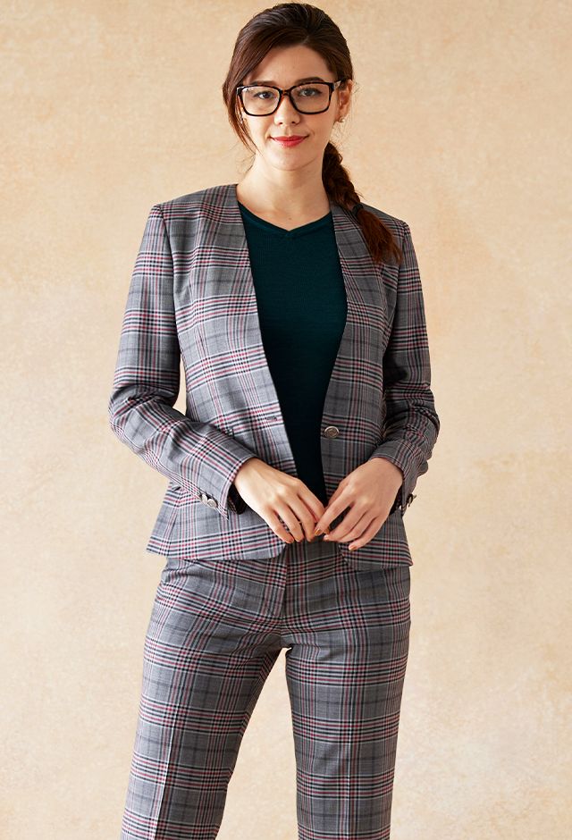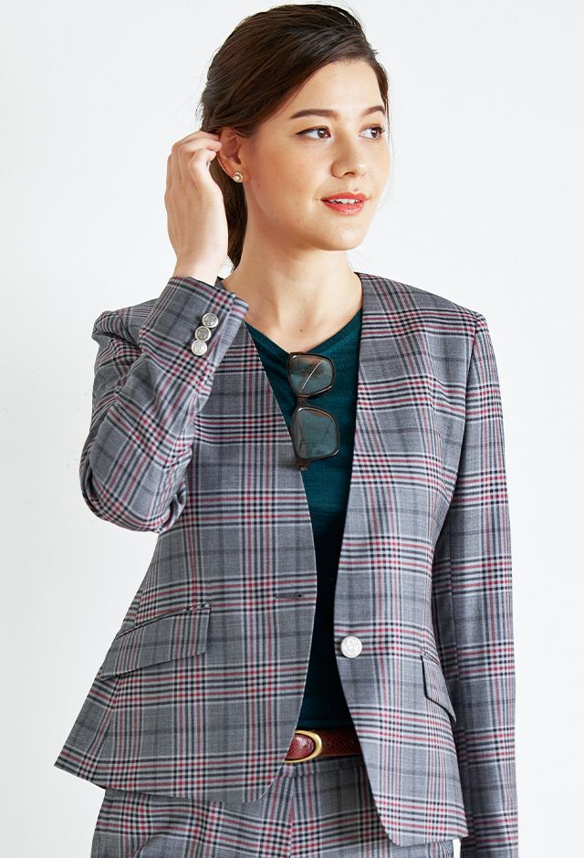 80ケ国以上にファンを持つ世界的なイギリスブランド「ドーメル」で仕立てたスーツです。グレーをベースに、ブラックやレッドのチェック柄があしらわれた生地で、オールシーズン着用していただけます。ジャケットはノーカラーモデル(ボタン)、ボトムスはクールなセミフレアパンツで仕立てました。ボタンにはグレーと相性の良いシルバーのメタルボタンをチョイス。ニットやパンプスは濃い色で締め、スーツのチェック柄をより際立たせたコーデに仕上げました。※生地在庫は変動いたしますのでご了承くださいませ。