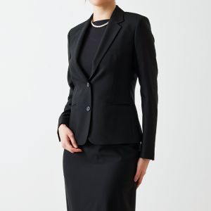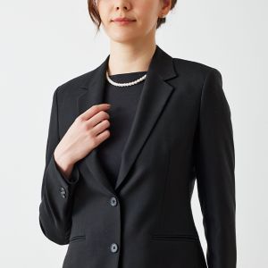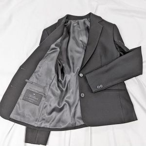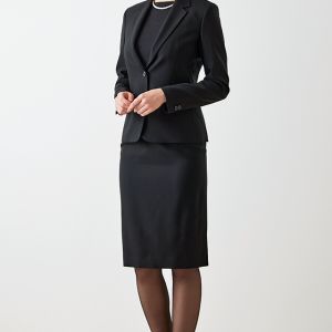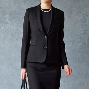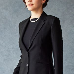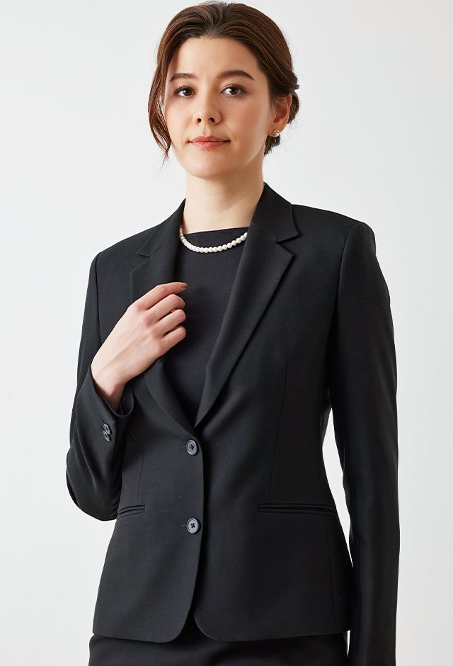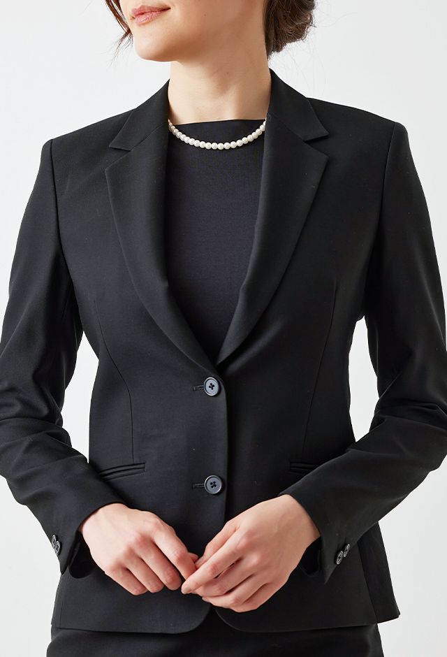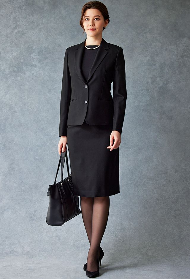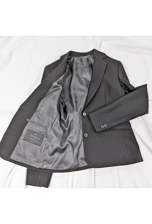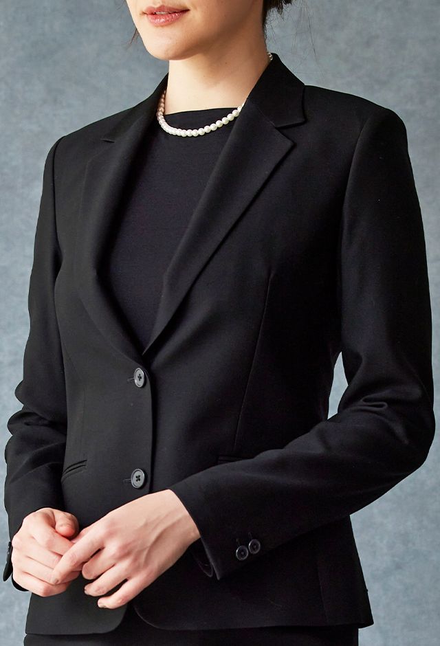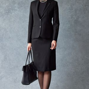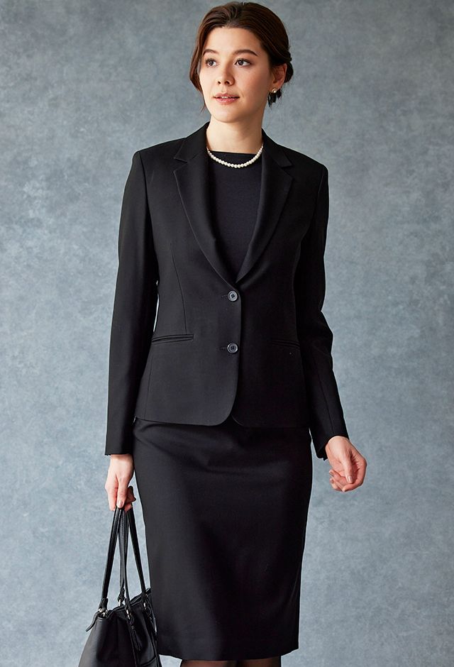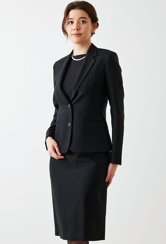 全て国産で作られた品のある生地感が特徴の「THE BLACK」で仕立てたスーツです。深みがあり、マットな質感のブラックカラーのスタイルで、オールシーズン着用していただけます。ジャケットはテーラーギビングモデル(2つボタン)、ボトムスは定番のスカートで仕立てました。ダークトーンのボタンで落ち着いた印象に。さらに、ポケットはフラップ無しでスッキリとした印象に。ブラックのアイテムと合わせてお悔やみ事(お通夜・告別式等の葬儀)の際に着用いただけるブラックフォーマルスーツスタイル(喪服)です。 ※生地在庫は変動いたしますのでご了承くださいませ。