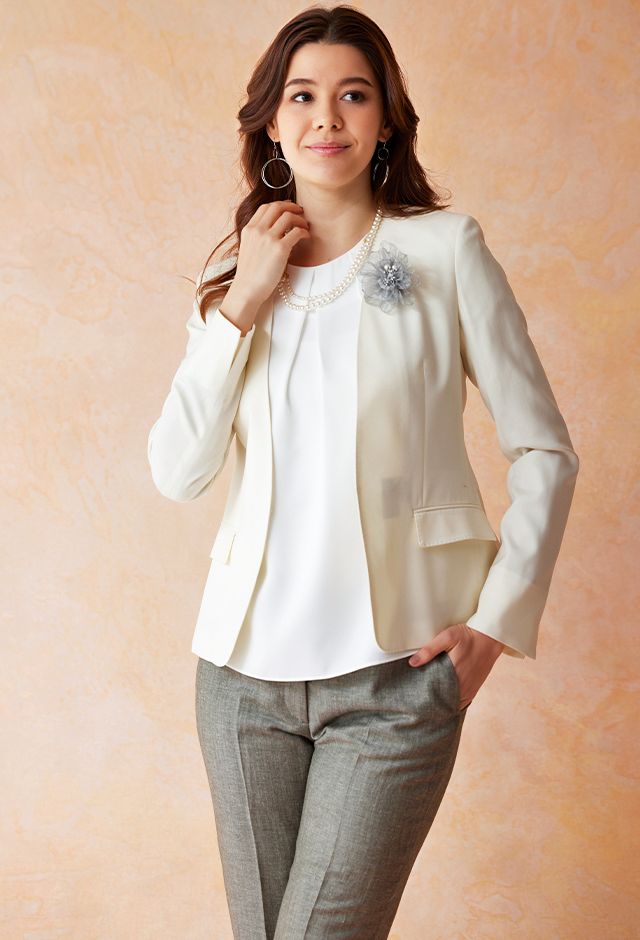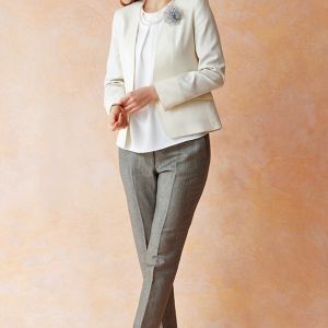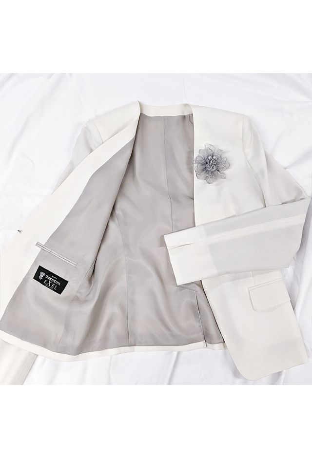 80ケ国以上にファンを持つ世界的なイギリスブランド「ドーメル」で仕立てたスーツです。お洒落な仕上がりになるホワイトカラー×無地のスタイルで、オールシーズン着用していただけます。ジャケットはノーカラーモデル(ホック)、ボトムスは人気のテーパードパンツで仕立てました。ポケットは最もオーソドックスなフラップが付いた平行タイプ。アッシュカラーのブローチをアクセントに、セレモニーシーンでおすすめの上品なコーディネートです。※生地在庫は変動いたしますのでご了承くださいませ。