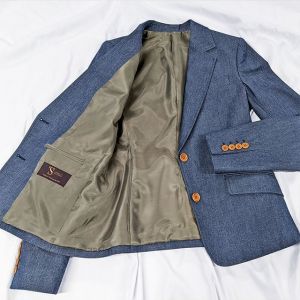 コットン系素材のバリエーションが豊富で、ファンシーなものや特徴的な柄ものを得意とする「ソンドリオ」で仕立てたスーツです。デニム調のネイビー×無地のスタイルで、オールシーズン着用していただけます。ジャケットはテーラーギビングモデル(2つボタン)、ボトムスは人気のテーパードパンツで仕立てました。裏地には趣きのあるカーキの無地をチョイス。シャツ・ベルトはボタンのライトブラウンと合わせることで、カジュアルに仕上げました。※生地在庫は変動いたしますのでご了承くださいませ。