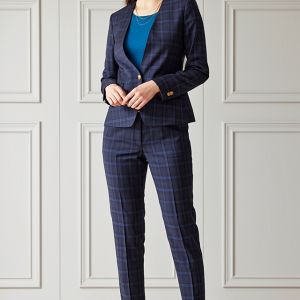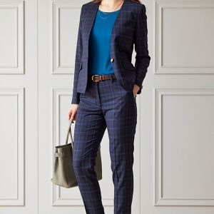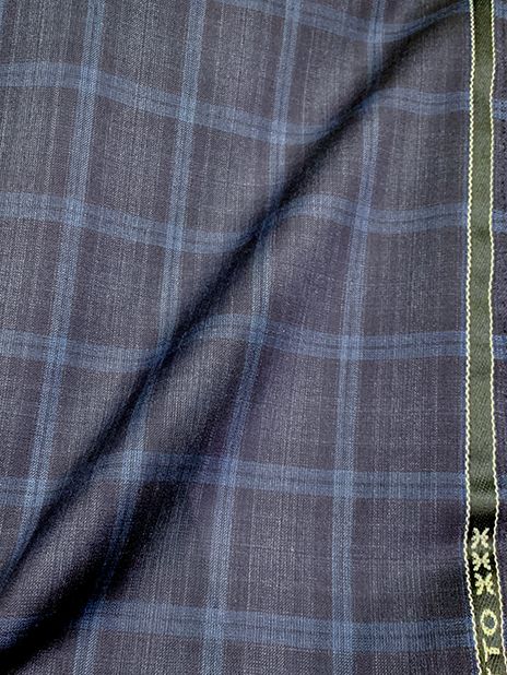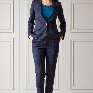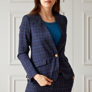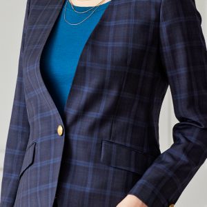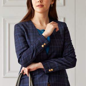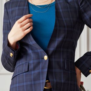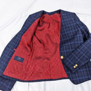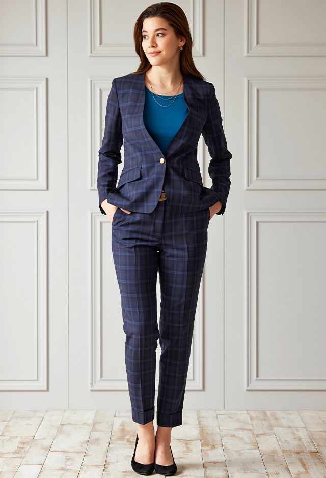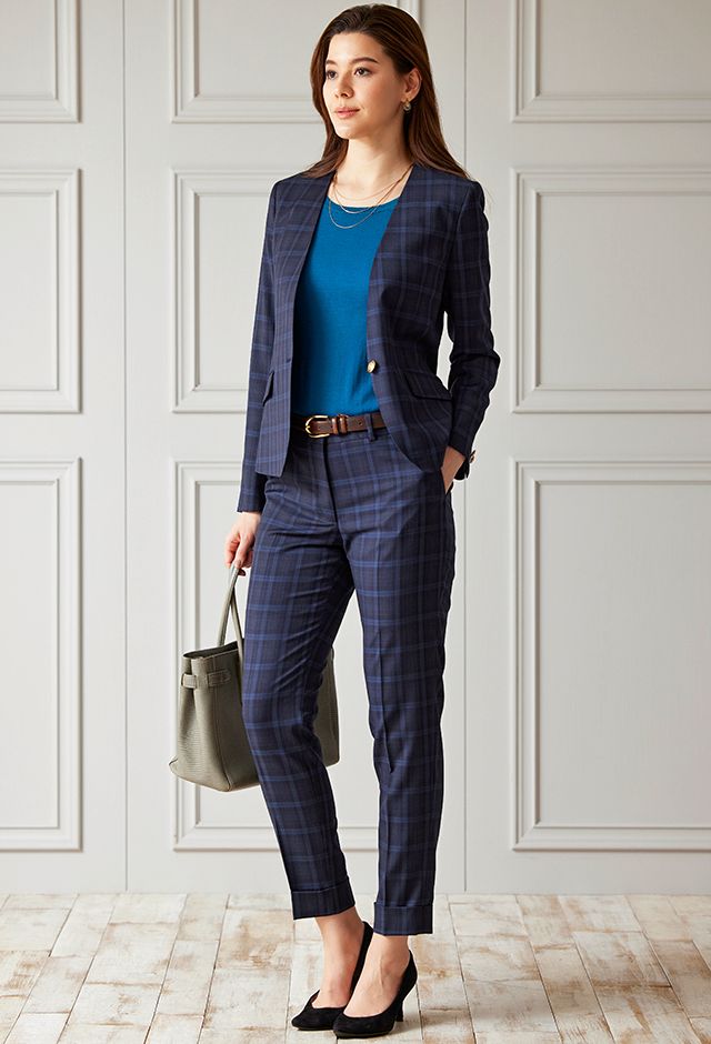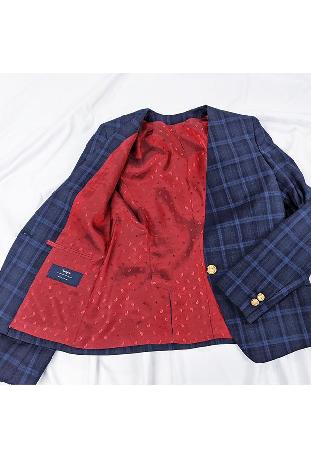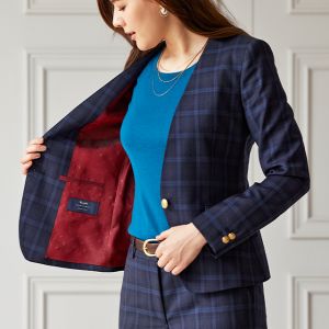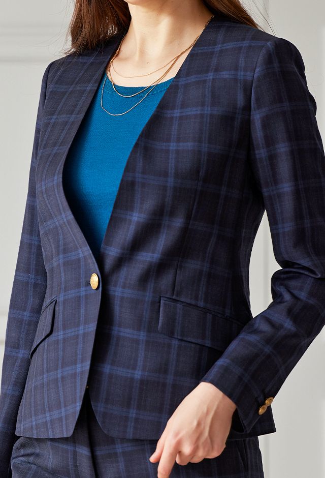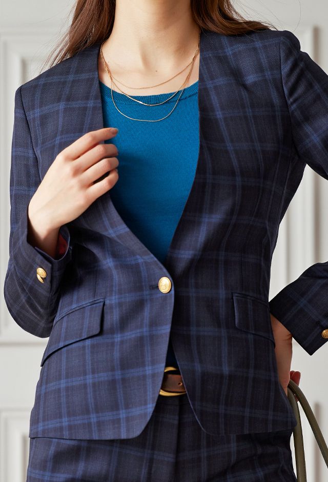 トレンドをふんだんに取り入れたデザイン性が特徴の「マルゾット」で仕立てたスーツです。ネイビーにザックリとしたチェック柄が印象的なスタイルで、オールシーズン着用していただけます。ジャケットはノーカラーモデル(ボタン)、ボトムスは人気のテーパードパンツで仕立てました。キラリと存在感のあるゴールドのメタルボタンをとりいれ、シャープな印象のスラント(斜め)ポケットを採用。ターコイズブルーのインナーと合わせて華やかなコーデに仕上げました。※生地在庫は変動いたしますのでご了承くださいませ。