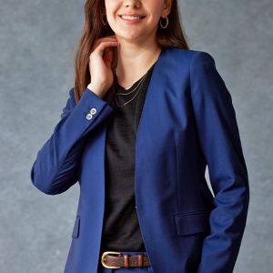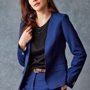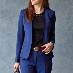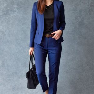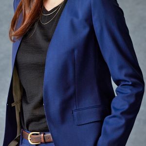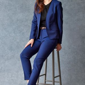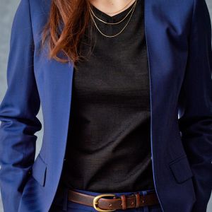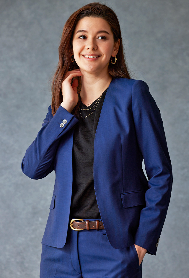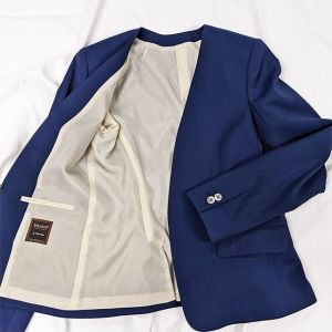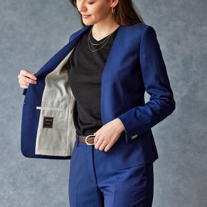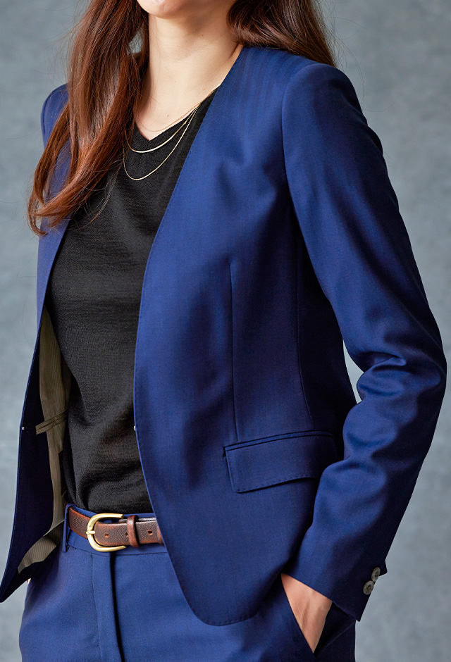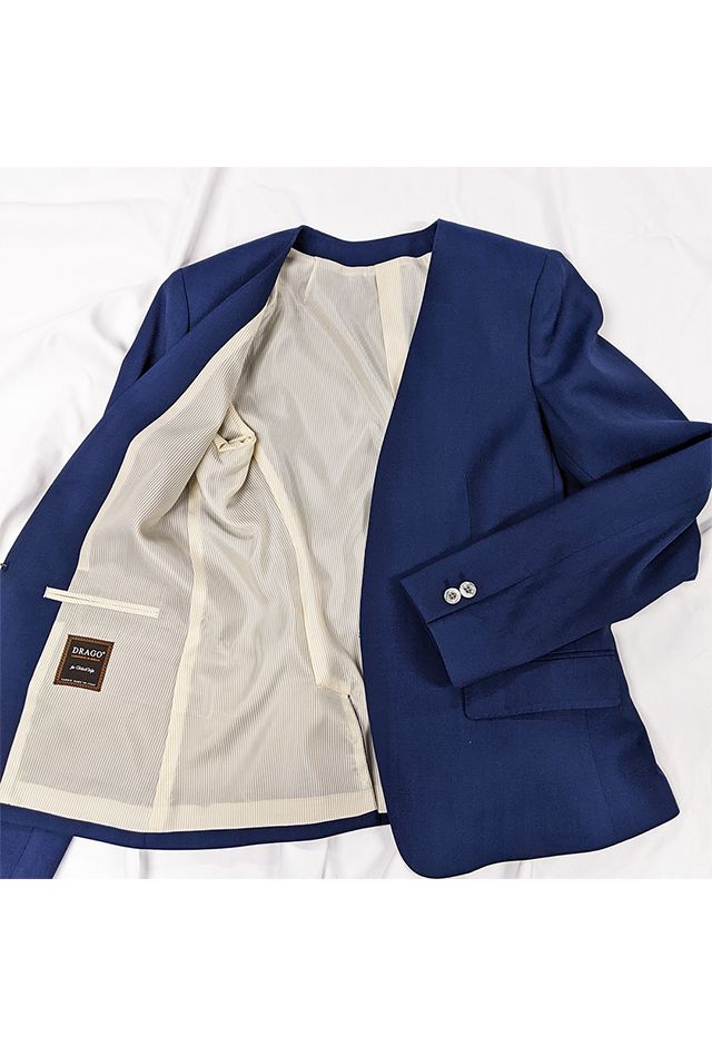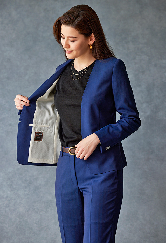 雨が多く多湿な気候を有する市場においても絶大な評価を獲得している「ドラゴ」で仕立てたスーツです。発色の美しいネイビーと上品なヘリンボーンストライプを組み合わせたスタイルで、オールシーズン着用していただけます。ジャケットはノーカラーモデル(ホック)、ボトムスは人気のテーパードパンツで仕立てました。パンツの裾口はビジネスシーンにも最適でポピュラーなシングルタイプ。ブラックのインナーやパンプスを組み合わせて洗練された印象に仕上げました。※生地在庫は変動いたしますのでご了承くださいませ。