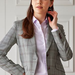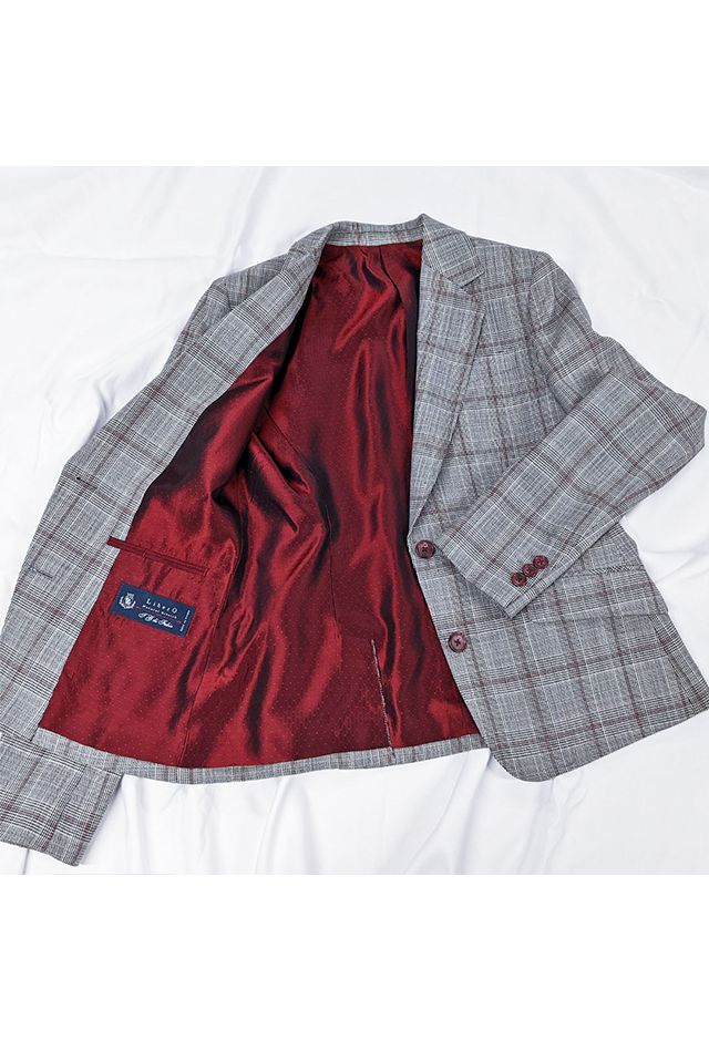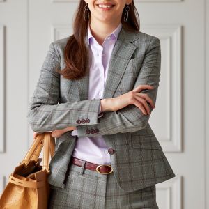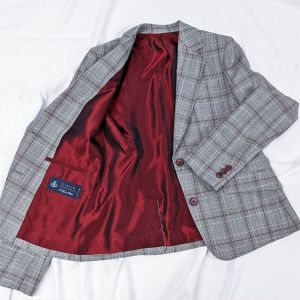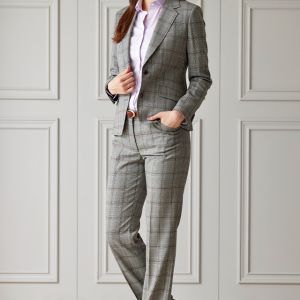 イタリア独自の風合いを活かした織り方に定評のある「タッリア・ディ・デルフィノ」で仕立てたスーツです。グレーチェックにレッドのチェックも合わせたスタイルで、オールシーズン着用していただけます。ジャケットはテーラーギビングモデル(2つボタン)、ボトムスはクールなセミフレアパンツで仕立てました。パンツの裾口はビジネスシーンにも最適でポピュラーなシングルタイプ。チェック柄に合わせたレッドの裏地やパンプス、レッドと相性の良いブラウンのベルトやボタンで統一感を演出しました。※生地在庫は変動いたしますのでご了承くださいませ。