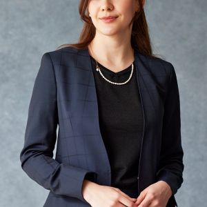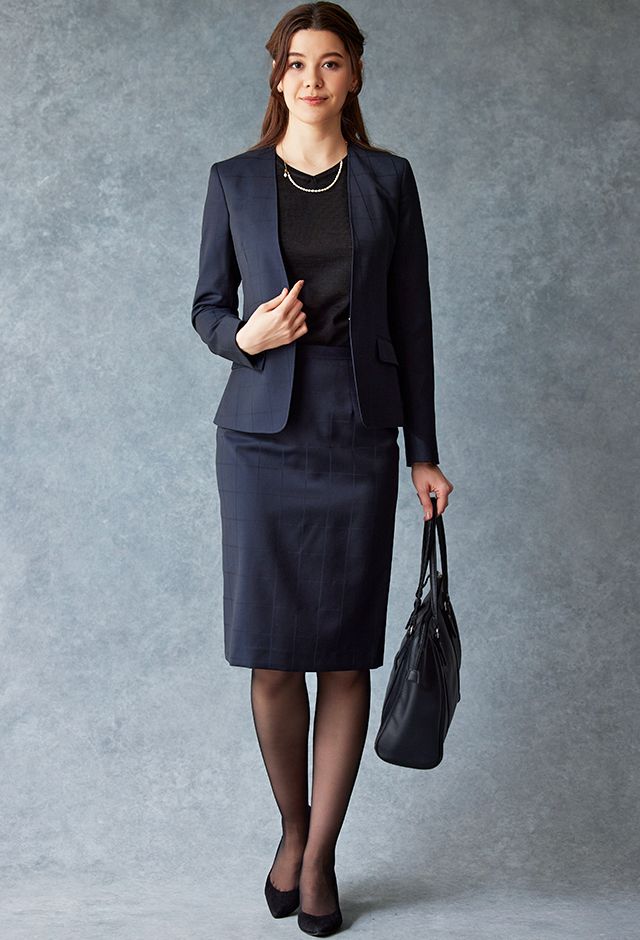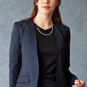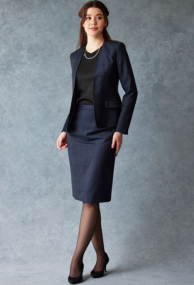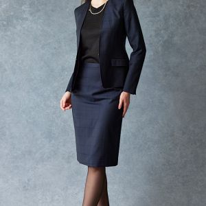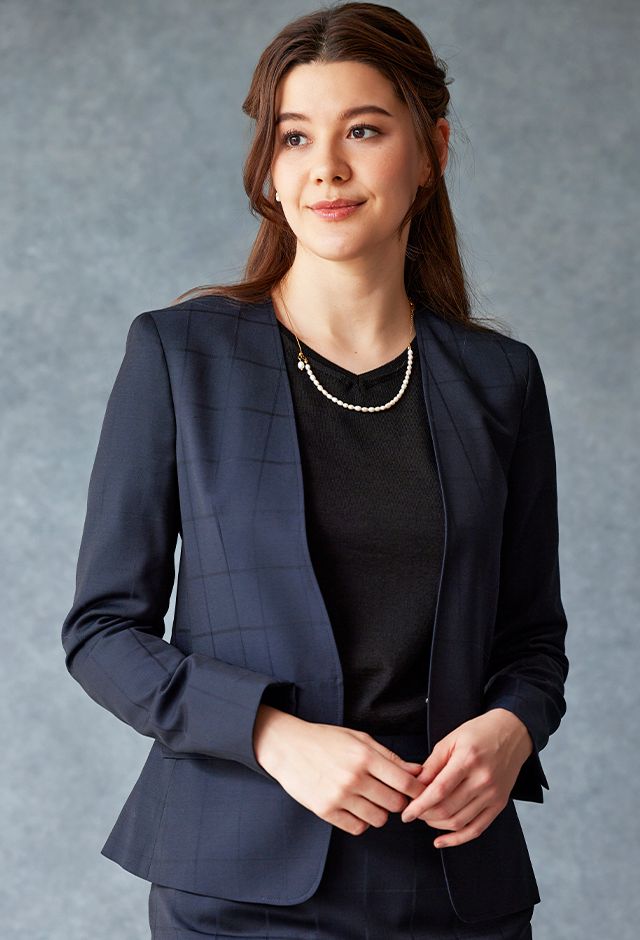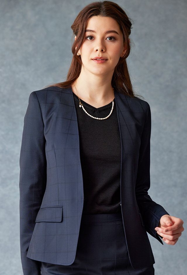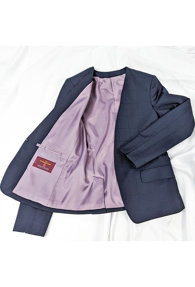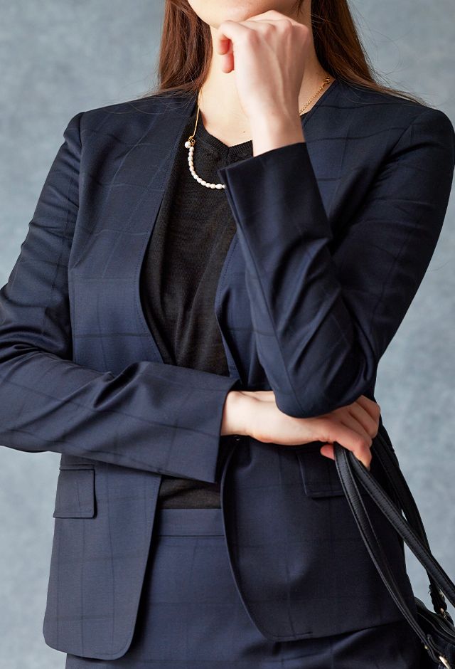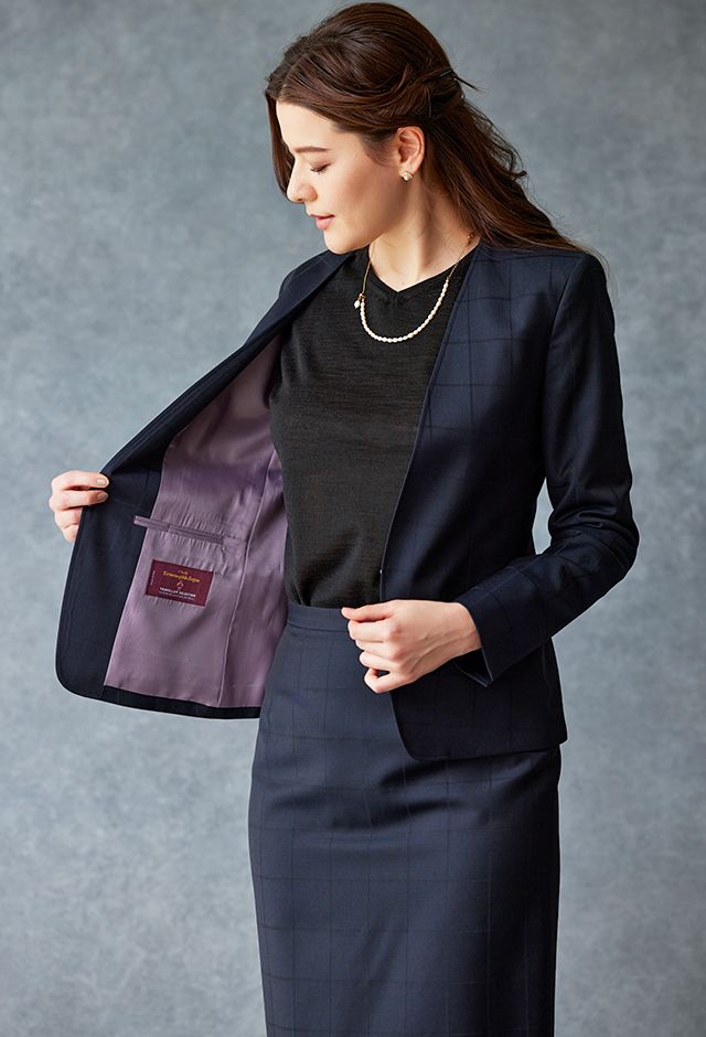 イタリアの高級生地ブランド「クロス エルメネジルド ゼニア」で仕立てたスーツです。定番のネイビーカラーにチェック柄のスタイルで、オールシーズン着用していただけます。ジャケットはノーカラーモデル(ホック)、ボトムスは定番のスカートで仕立てました。裏地にはラベンダーカラーで大人な魅力を感じさせ、袖口はボタン無しのスリットを採用。ブラックのインナーや小物アイテムで全体的にシックで上品な雰囲気に仕上げました。※生地在庫は変動いたしますのでご了承くださいませ。