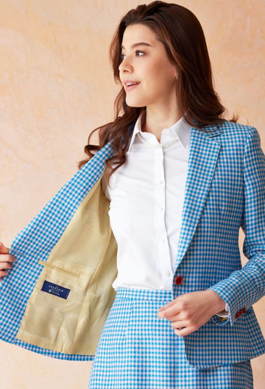 コストパフォーマンスの高さもからも支持されている「アンジェリコ」でお仕立てしたスーツです。清潔感を感じられるブルーのギンガムチェックのスタイルで、春夏シーズンの生地になります。ジャケットはテーラーギビングモデル(1つボタン)、ボトムスは程よいフレア加減で着回しやすい定番のフレアスカートで仕立てました。ボタンには、春夏の生地にぴったりのナットボタンを取り入れました。ホワイトシャツでスーツカラーが引き立つ爽やかなコーデで、セレモニーシーンにも重宝します。※生地在庫は変動いたしますのでご了承くださいませ。