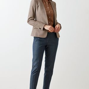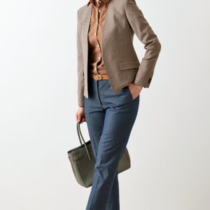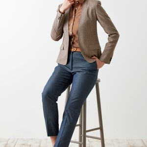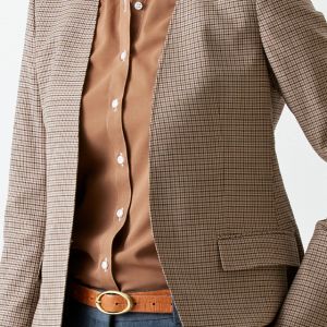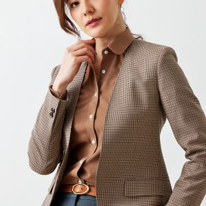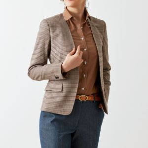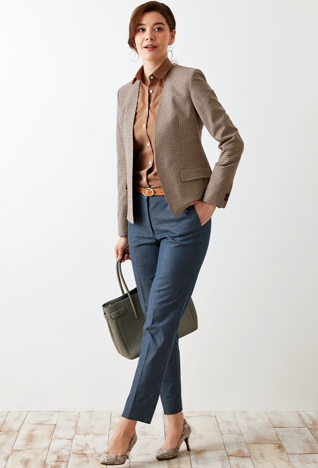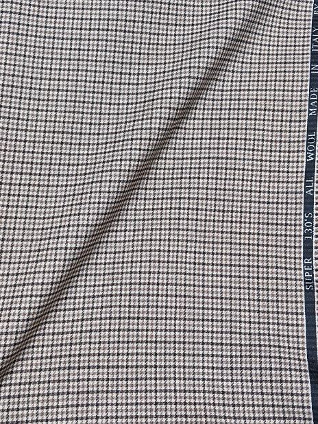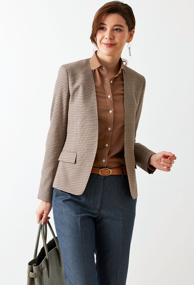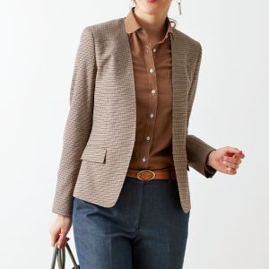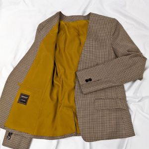 雨が多く多湿な気候を有する市場においても絶大な評価を獲得している「ドラゴ」で仕立てたスーツです。ベージュをベースとしたもっとも細かいチェック柄の「マイクロチェック」のスタイルで、オールシーズン着用していただけます。ジャケットはノーカラーモデル(ホック)、ボトムスは人気のテーパードパンツで仕立てました。ポケットは最もオーソドックスなフラップが付いた平行タイプ。小物アイテムなど全体的にアースカラー風でまとめたナチュラルなコーデに仕上げました。※生地在庫は変動いたしますのでご了承くださいませ。