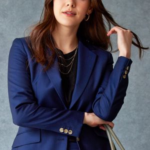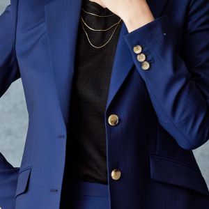 イタリアの高級生地ブランド「クロス エルメネジルド ゼニア」で仕立てたスーツです。深みのあるネイビーの発色が魅力的なヘリンボーンストライプのスタイルで、オールシーズン着用していただけます。ジャケットはテーラーギビングモデル(2つボタン)、ボトムスは定番のスカートで仕立てました。ポケットは斜め(スラント)にすることでシャープな印象に仕上がります。ブラックのインナーやパンプスを組み合わせてクールな印象に仕上げました。※生地在庫は変動いたしますのでご了承くださいませ。