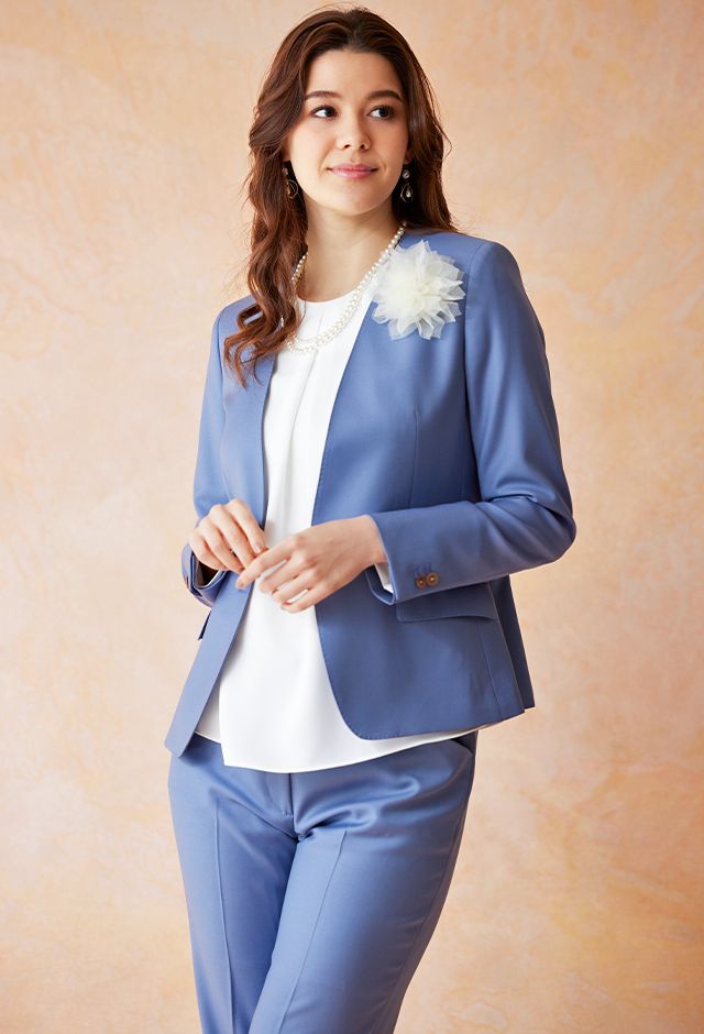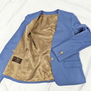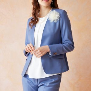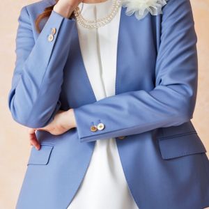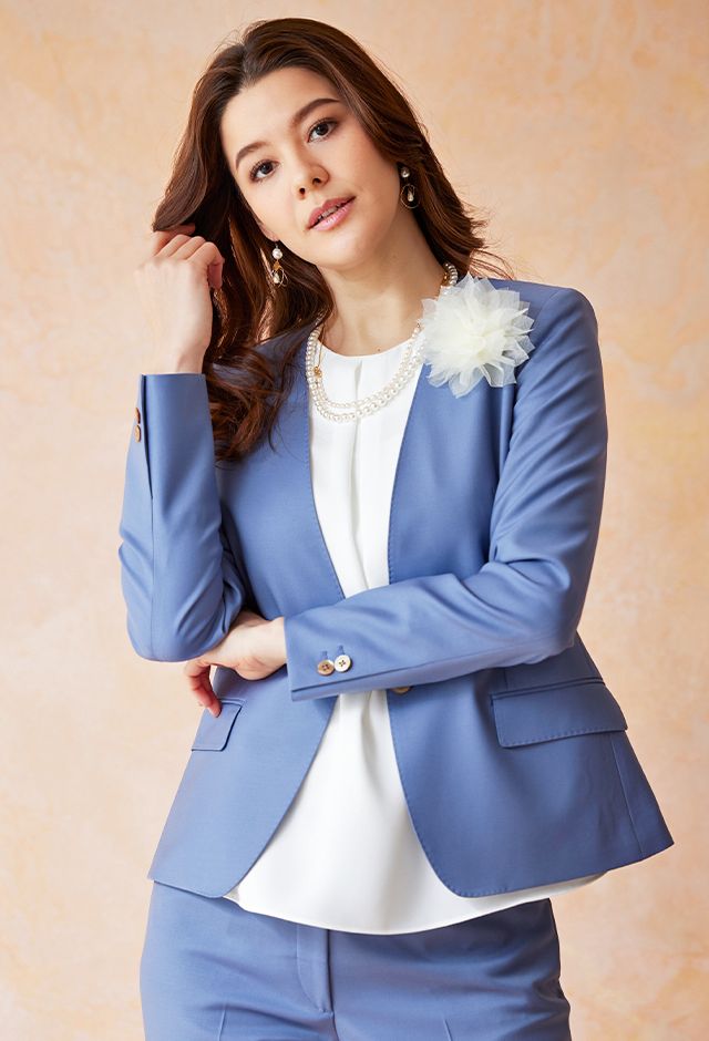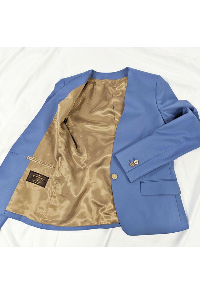 高品質でコストパフォーマンスに優れたイタリアブランド「カノニコ」で仕立てたスーツです。柔らかな発色のブルーと無地のスタイルで、オールシーズン着用していただけます。ジャケットはノーカラーモデル(ボタン)、ボトムスはクールなセミフレアパンツで仕立てました。ボタンには、見る角度で輝きの変わるキラキラと美しい貝ボタンを取り入れました。ホワイトのアイテムで合わせて爽やかな雰囲気に仕上げました。セレモニーシーンにもおすすめのコーディネートです。 ※生地在庫は変動いたしますのでご了承くださいませ。