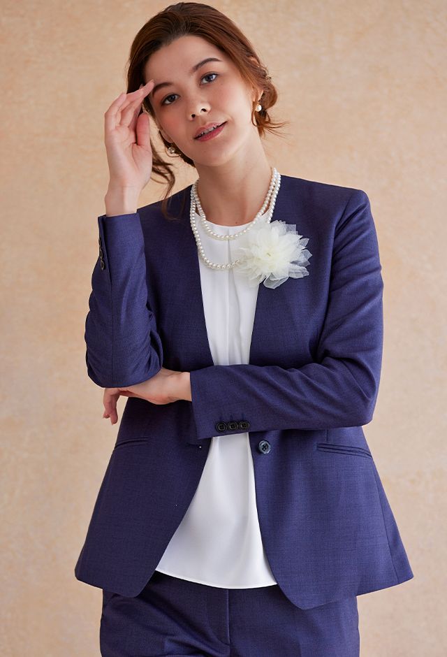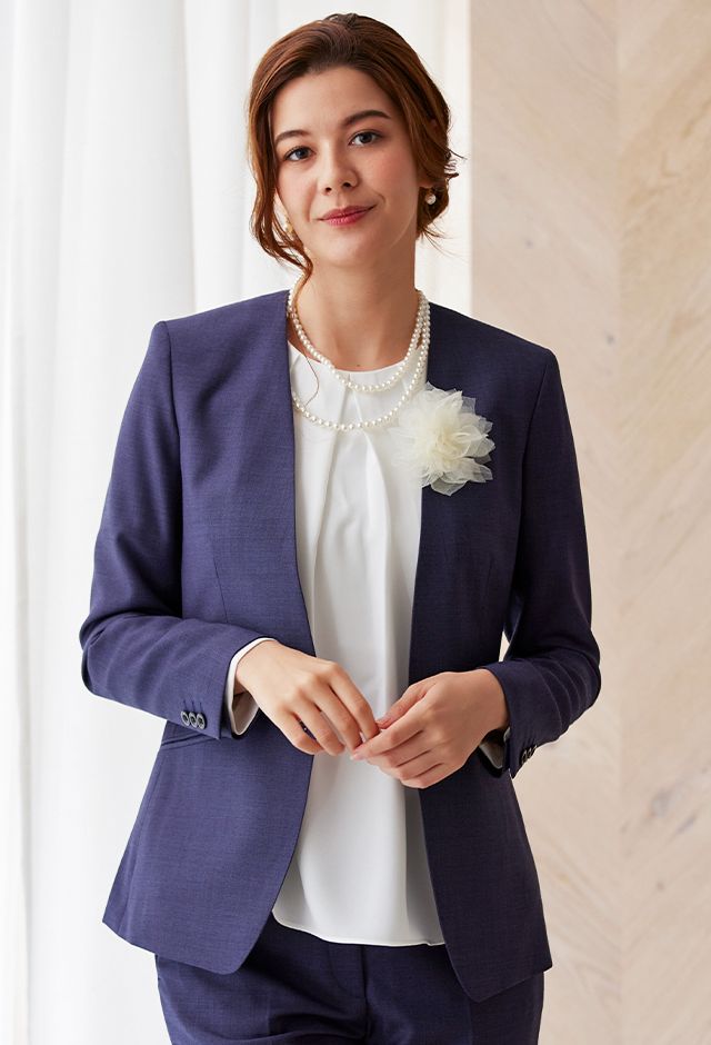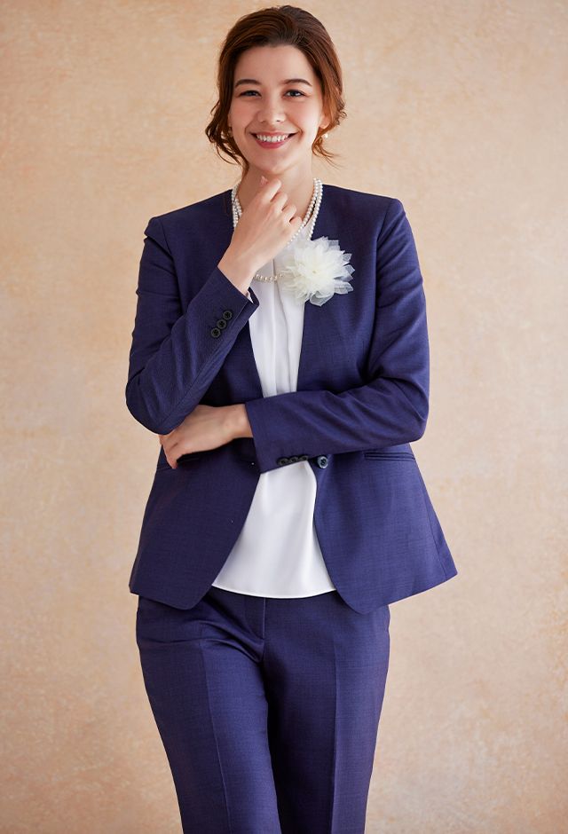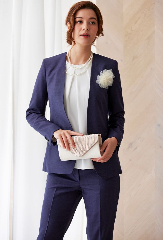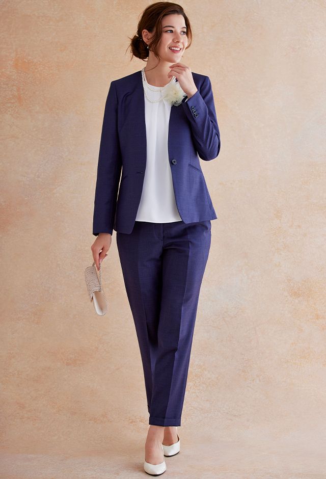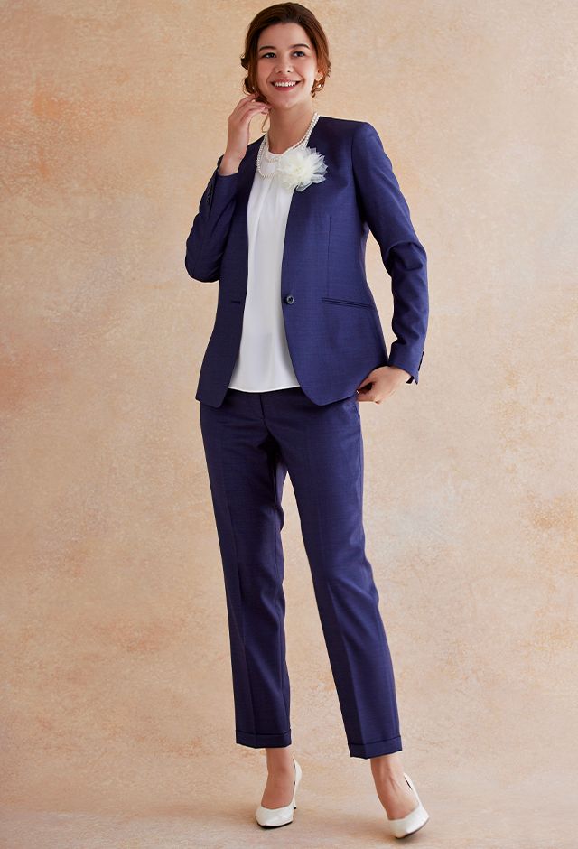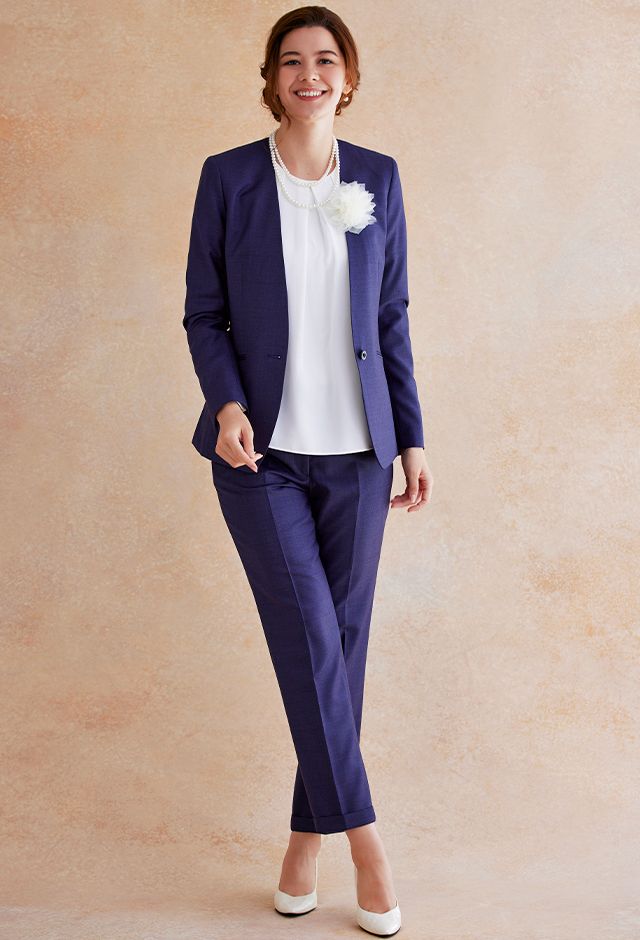 高品質でコストパフォーマンスに優れたイタリアブランド「カノニコ」で仕立てたスーツです。深みのあるネイビー系パープルカラーのスタイルで、オールシーズン着用していただけます。ジャケットはノーカラーモデル(ボタン)、ボトムスは人気のテーパードパンツで仕立てました。ポケットは斜め(スラント)で、フラップ無しですっきりと。ホワイトのアイテムで揃えてスーツカラーが引き立つシンプルなコーディネートに仕上げました。結婚式参列などのパーティーシーンにも重宝します。※生地在庫は変動いたしますのでご了承くださいませ。