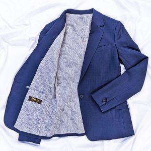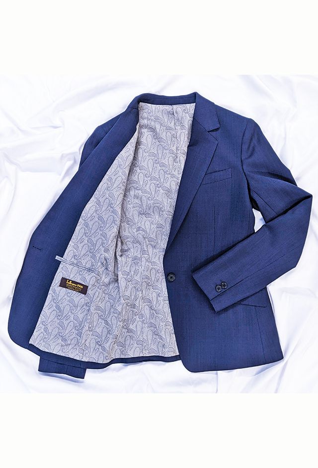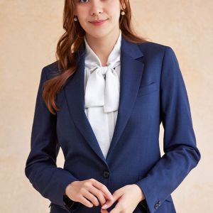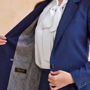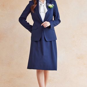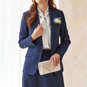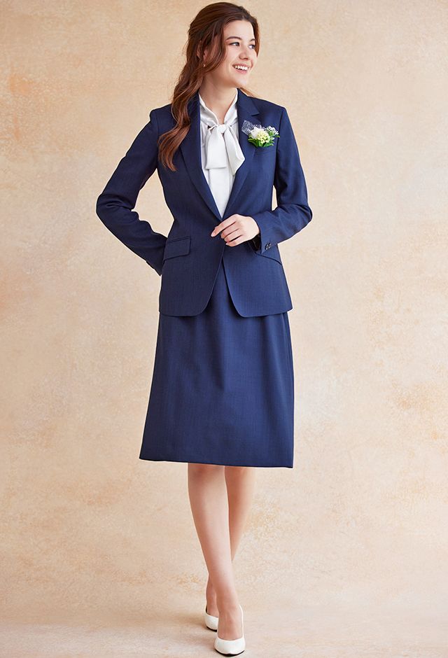 コストパフォーマンスの高さからも人気の高い「トレーニョ」で仕立てたスーツです。人気の高いネイビーカラーの無地のスタイルで、オールシーズン着用していただけます。ジャケットはテーラーギビングモデル(1つボタン)、ボトムスは程よいフレア加減で着回しやすい定番のフレアスカートで仕立てました。ボタンはブラックでシンプルに、裏地はペイズリー柄にすることでさりげないお洒落を楽しめます。オフホワイトのリボンがついたインナーを合わせた、セレモニーシーンにも重宝するコーデです。※生地在庫は変動いたしますのでご了承くださいませ。