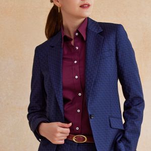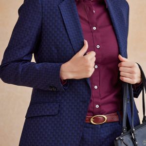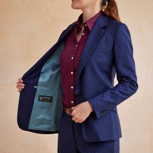 80ケ国以上にファンを持つ世界的なイギリスブランド「ドーメル」で仕立てたスーツです。個性的で特徴のあるチェック×ネイビーのスタイルで、オールシーズン着用していただけます。ジャケットはテーラーギビングモデル(1つボタン)、ボトムスは人気のテーパードパンツで仕立てました。ポケットはシャープな印象のスラント(斜め)を採用。鮮やかなスカイブルーの裏地で明るい雰囲気に。ワインレッドのシャツと合わせることで、ネイビーとのコントラストが映えるコーデに仕上げました。