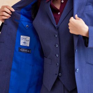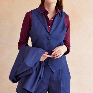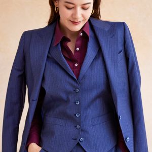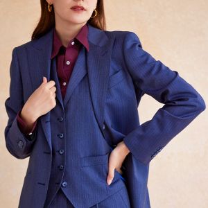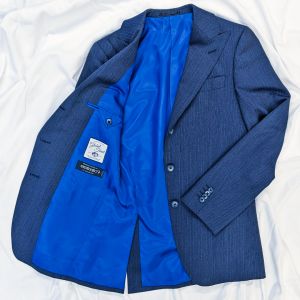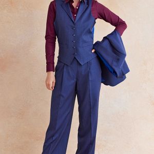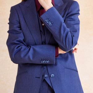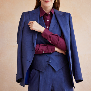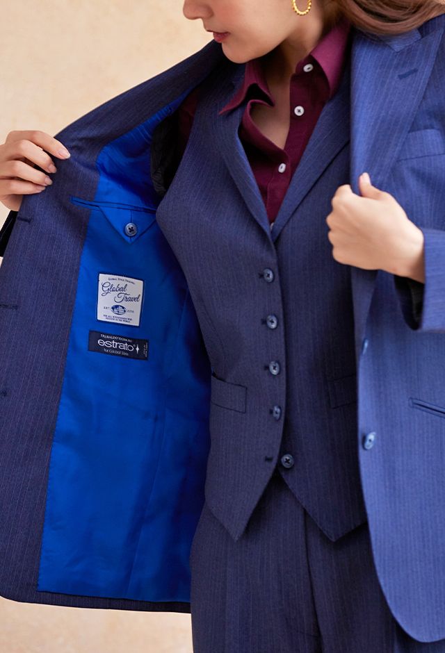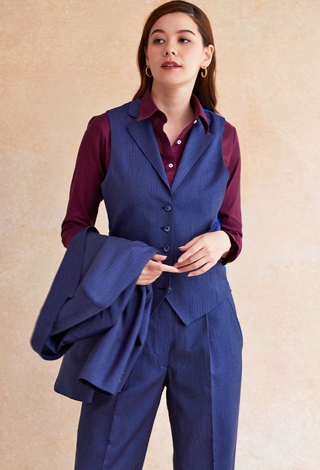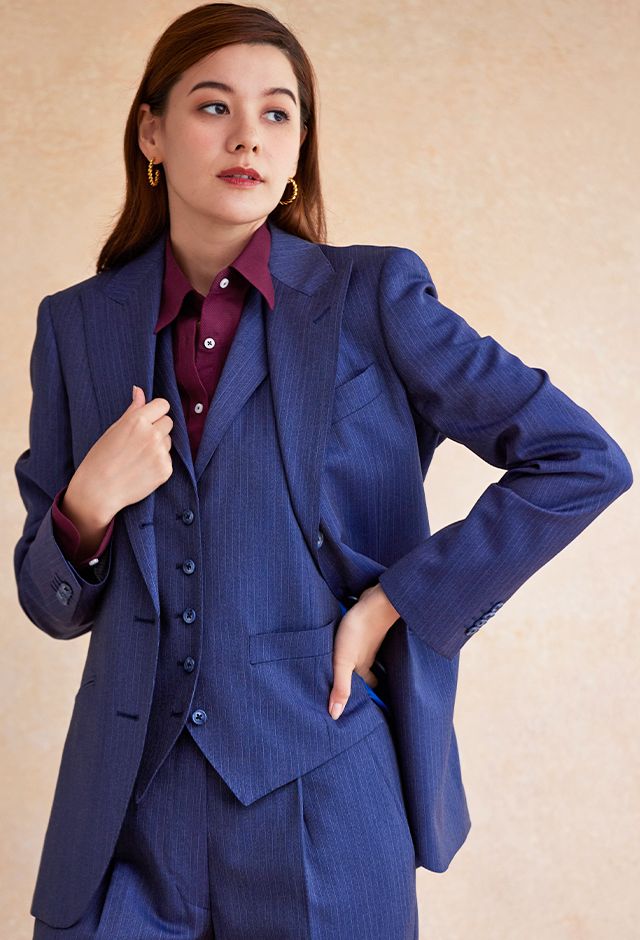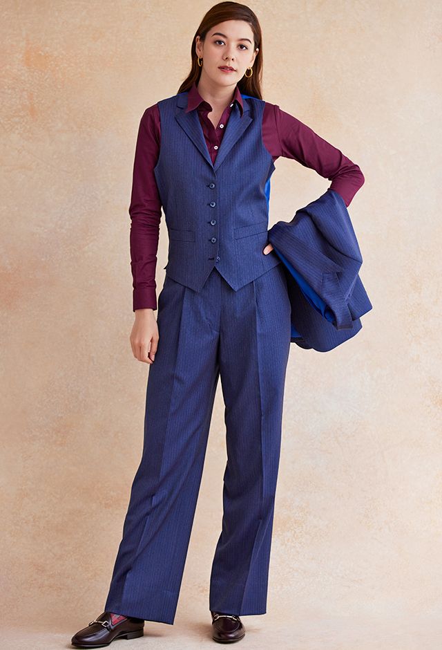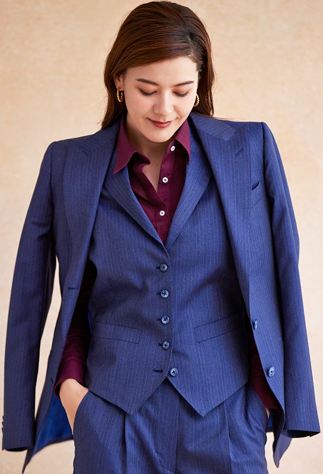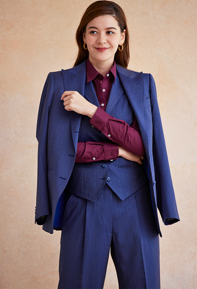 ストレッチ性の高い生地が大好評のイタリアブランド「トラバルド・トーニャ」で仕立てたスーツです。シャープな印象のブルーカラー×ストライプのスタイルで、オールシーズン着用していただけます。クラシックな部分とセクシーさを融合したモダンクラシックモデルで仕立てました。袖口は重ねボタン仕様で手元に立体感を持たせ、ベストは重厚感を感じられる襟付きをチョイス。濃いパープルのシャツと合わせて、色気のある大人っぽい雰囲気に仕上げました。※こちらはメンズモデルでお仕立てしたスーツになります。パンツはメンズモデルからさらにワイドパンツ風にアレンジしたものになります。