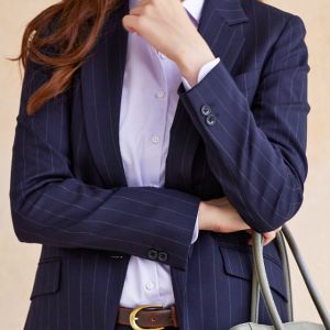 コストパフォーマンスの高さからも人気の高い「トレーニョ」で仕立てたスーツです。堅実なイメージのあるネイビー×ストライプのスタイルで、オールシーズン着用していただけます。ジャケットはテーラーギビングモデル(1つボタン)、ボトムスは人気のテーパードパンツで仕立てました。グレーの裏地や、同系色のボタンでシンプルなディテールに。深みのあるレッドのパンプスをアクセントに、大人な印象に仕上げました。※生地在庫は変動いたしますのでご了承くださいませ。