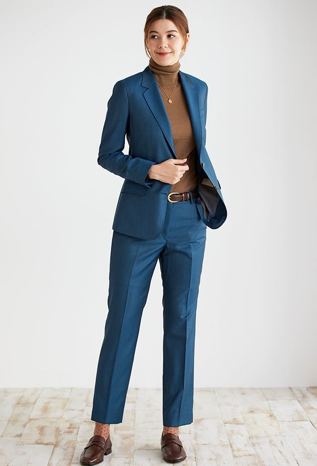80ケ国以上にファンを持つ世界的なイギリスブランド「ドーメル」で仕立てたスーツです。人気のアースカラーである、ブルーグリーン×無地のスタイルで、オールシーズン着用していただけます。ジャケットはテーラーギビングモデル(2つボタン)、ボトムスは人気のテーパードパンツで仕立てました。ステッチを入れ襟の形を綺麗に見せ、上品で清潔感のある雰囲気に。小物アイテムはブラウンのアースカラーでまとめ、キラリと光るゴールドネックレスでアクセントをプラス。※生地在庫は変動いたしますのでご了承くださいませ。