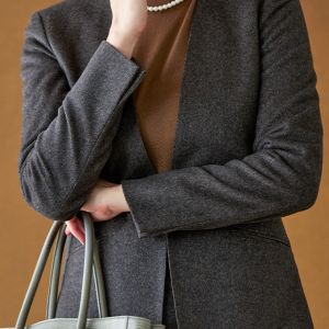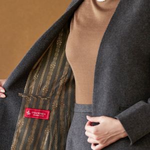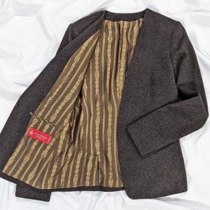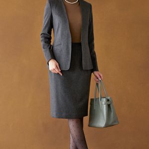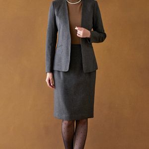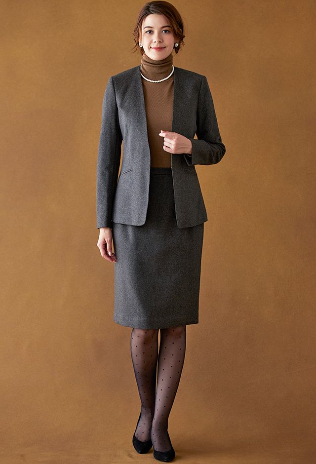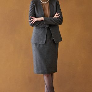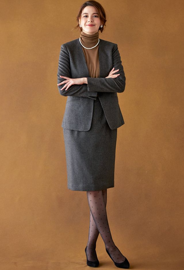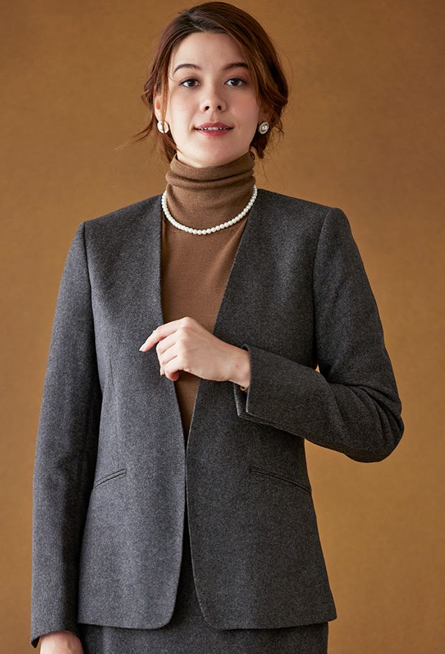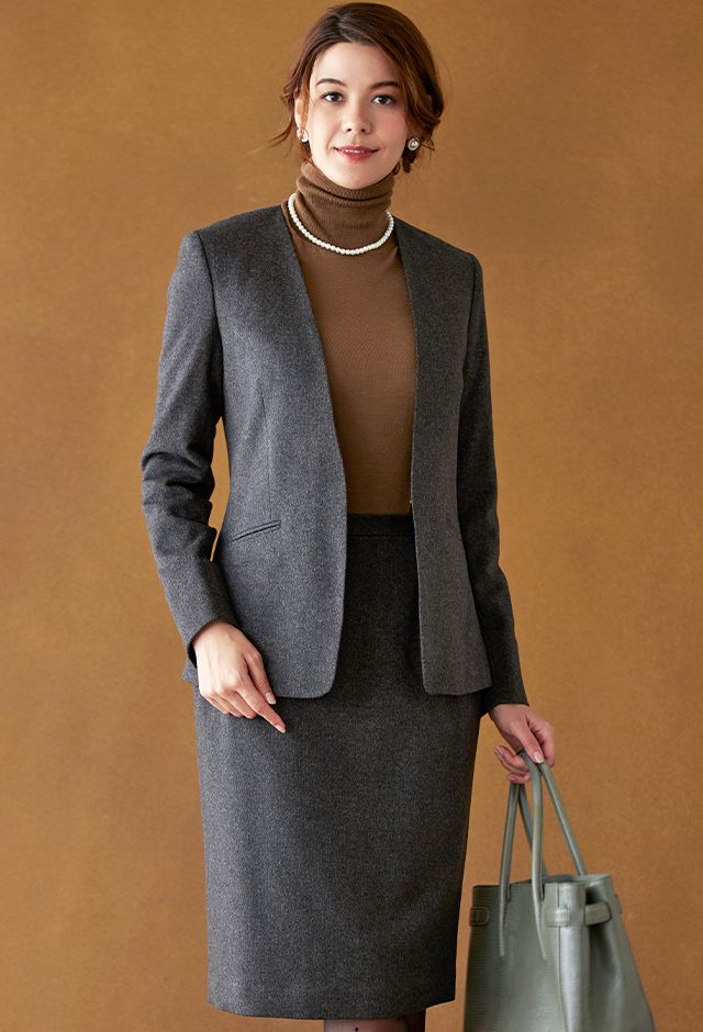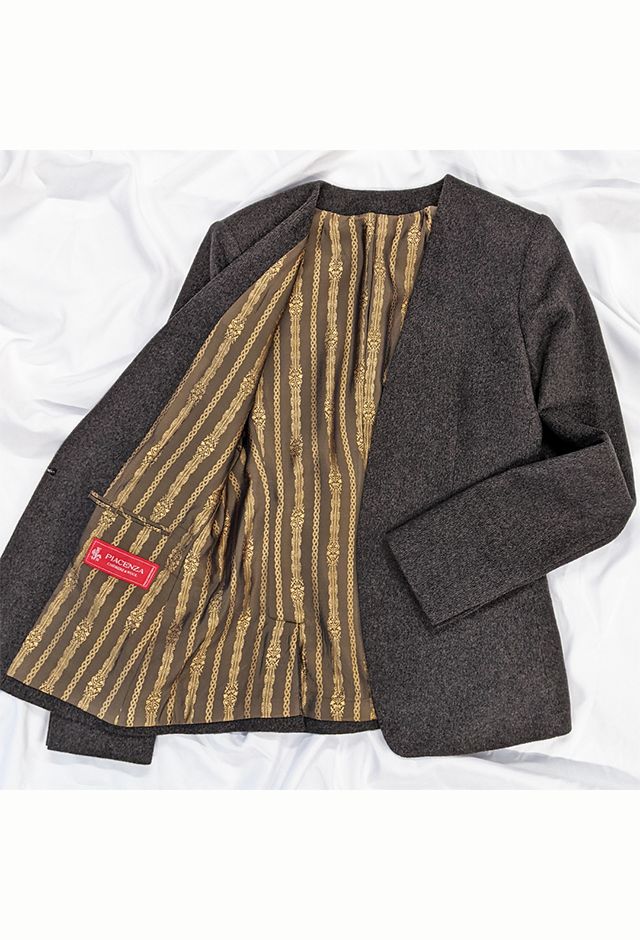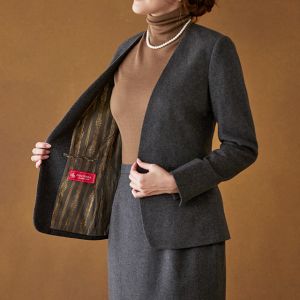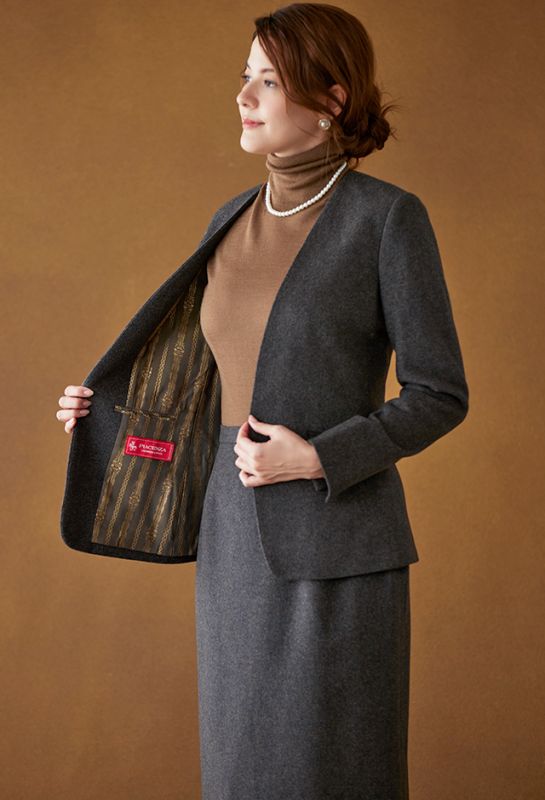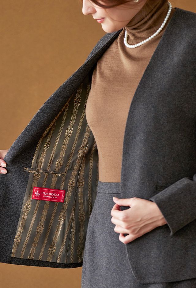 最高級の原材料を使用することを徹底し、世界的に評価される品質を保つ「ピアチェンツァ」で仕立てたスーツです。温かみのあるグレー×無地のスタイルで、秋冬シーズンの生地になります。ジャケットはノーカラーモデル(ホック)、ボトムスは定番のスカートで仕立てました。ジャケットには、腰回りをすっきりと見せる効果のあるフラップ無しのポケットを採用。さらに袖ボタンもなくし寄りすっきりと見せることも。ジャケットの裏地には、存在感のあるラグジュアリーなデザインをチョイス。袖口はボタン無しのスリットが入っており、すっきりとした印象に。※生地在庫は変動いたしますのでご了承くださいませ。