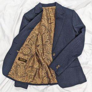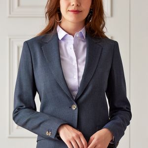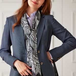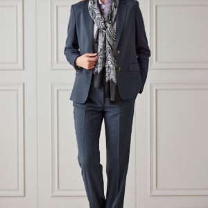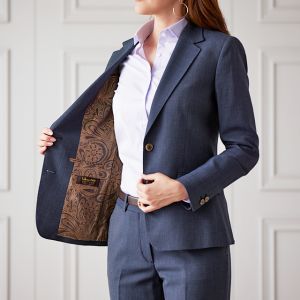 コストパフォーマンスの高さからも人気の高い「トレーニョ」で仕立てたスーツです。趣のあるブルーグレー×バーズアイのスタイルで、オールシーズン着用していただけます。ジャケットはテーラーギビングモデル(2つボタン)、ボトムスはクールなセミフレアパンツで仕立てました。ジャケットの裾はサイドベンツを採用することで、クラシックなデザインに仕上げました。差し色でレッドのパンプスをチョイス。ストールを巻いて上品なコーデなどもおすすめです。※生地在庫は変動いたしますのでご了承くださいませ。