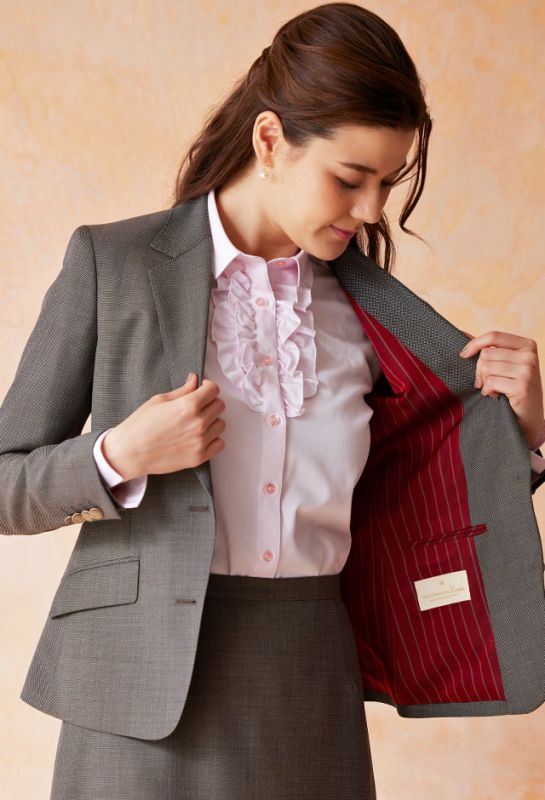トレンドをふんだんに取り入れたデザイン性が特徴の「マルゾット」で仕立てたスーツです。シンプルで重宝するネイビー×無地のスタイルで、オールシーズン着用していただけます。ジャケットはテーラーギビングモデル(1つボタン)、程よいフレア加減で着回しやすい定番のフレアスカートで仕立てました。ポケットは斜め(スラント)にすることでシャープな印象に仕上がります。小物アイテムはシックなカラーでまとめて上品で落ち着いた印象を与えるコーディネートに。