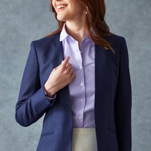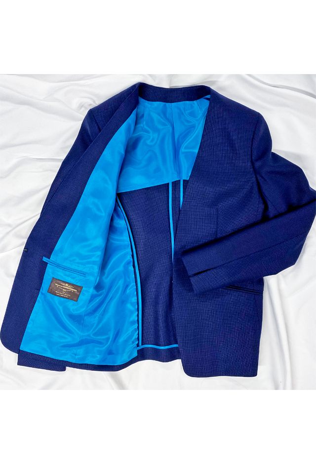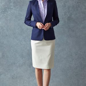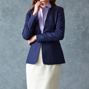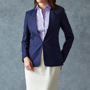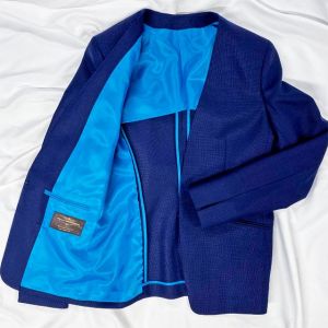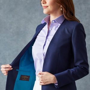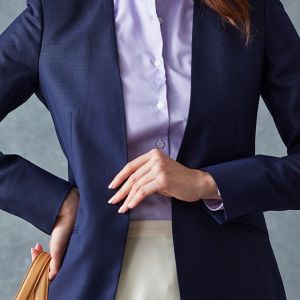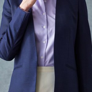 高品質でコストパフォーマンスに優れたイタリアブランド「カノニコ」で仕立てたスーツです。人気の高いネイビーカラーの無地のスタイルで、春夏シーズンの生地になります。ジャケットはノーカラーモデル(ホック)、ボトムスは定番のタイトスカートで仕立てました。ボタンレスのジャケットを採用し、スッキリと。裏地はライトブルーで明るい印象をプラス。パープルのシャツや白スカートと組み合わせることで、大人な印象のコーデに仕上げました。