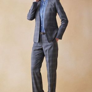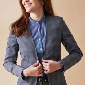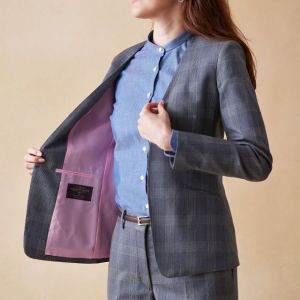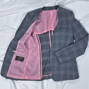 高品質でコストパフォーマンスに優れたイタリアブランド「カノニコ」で仕立てたスーツです。グレーをベースにライトグレーチェック柄のスタイルで、オールシーズン着用していただけます。ジャケットはノーカラーモデル(ホック)、ボトムスはクールなセミフレアパンツで仕立てました。斜め+フラップ無しのポケットにすることでもっともシャープな印象となります。クールな見た目ですが、ピンクの裏地で可愛らしさもプラス。デニム風のシャツでややカジュアルダウンしたコーデとなり、親しみやすさも感じられます。