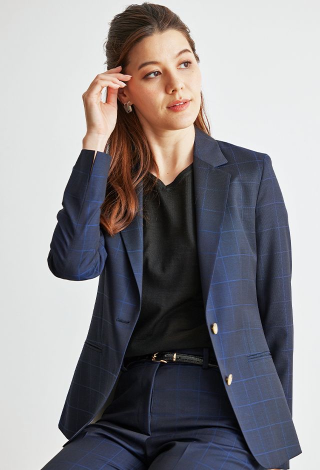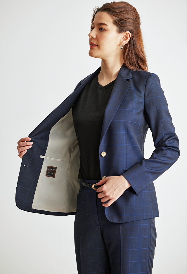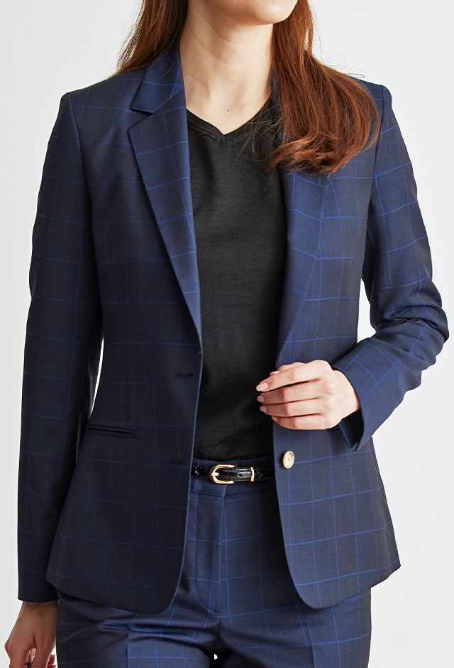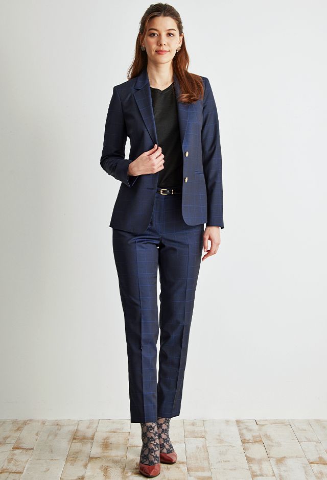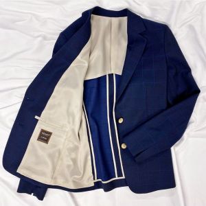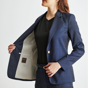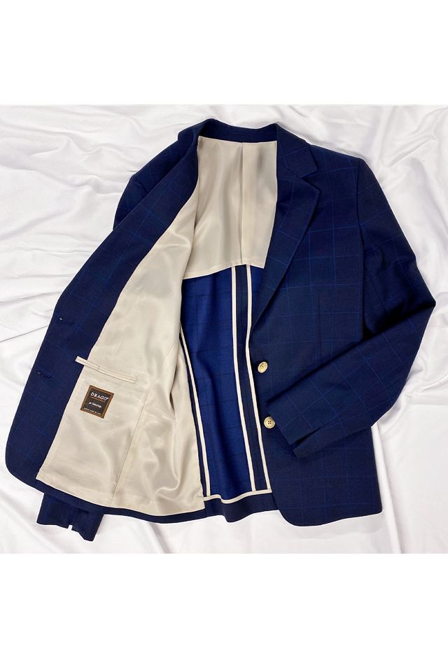 雨が多く多湿な気候を有する市場においても絶大な評価を獲得している「ドラゴ」で仕立てたスーツです。シンプルながらこなれ感を感じさせるウィンドウペン×ネイビーのスタイルで、オールシーズン着用していただけます。ジャケットはテーラーギビングモデル(2つボタン)、ボトムスは人気のテーパードパンツで仕立てました。腰回りをすっきりと見せる効果のあるフラップ無しのポケットを採用。印象的なレースソックスを取り入れて他にはない個性の光る着こなしを楽しむことが出来ます。