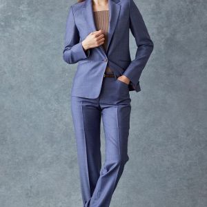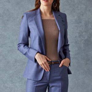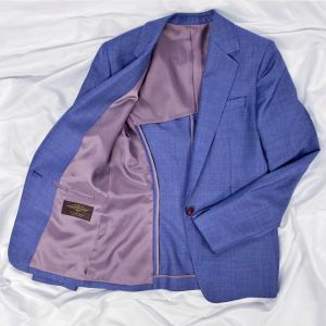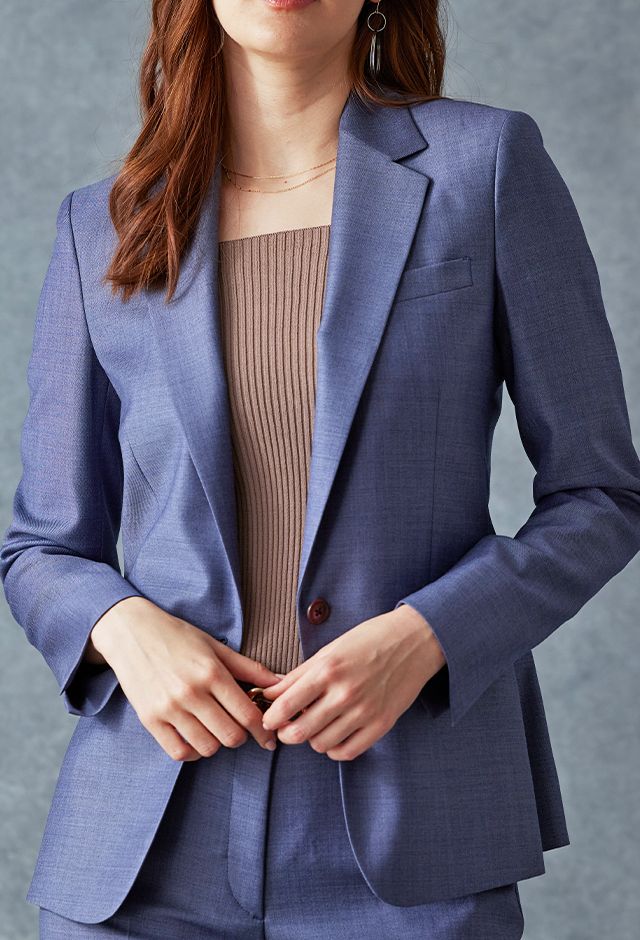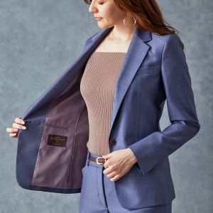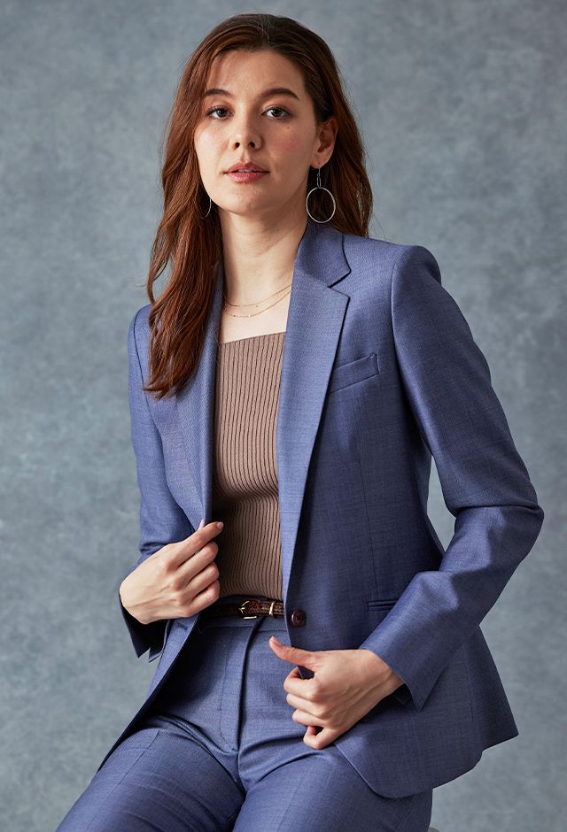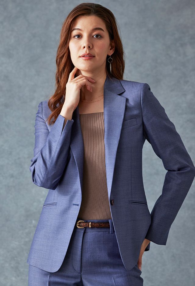 高品質でコストパフォーマンスに優れたイタリアブランド「カノニコ」で仕立てたスーツです。ブルーも感じられるパープル×無地のスタイルで、オールシーズン着用していただけます。ジャケットはテーラーギビングモデル(1つボタン)、ボトムスはクールなセミフレアパンツで仕立てました。パンツの裾は太めのダブルを採用しクラシカルな雰囲気と、重厚感を漂わせます。ベージュのインナーにレッドのパンプスを合わせて洗練されたコーデに仕上げました。