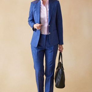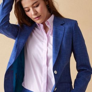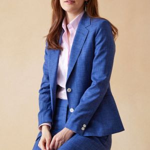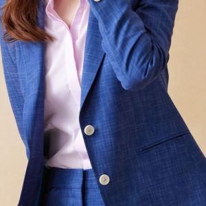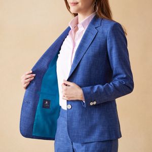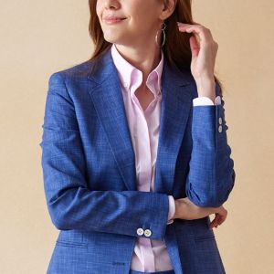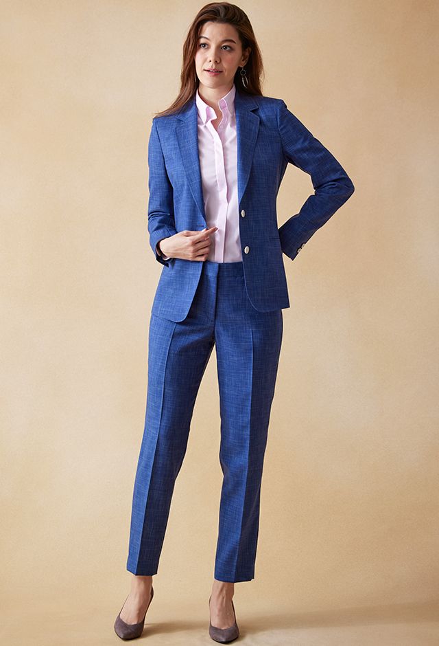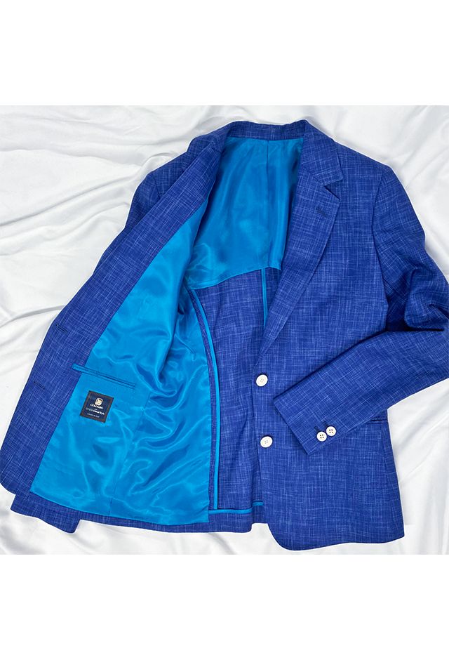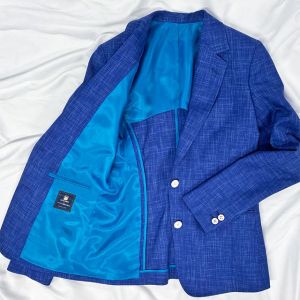 最高級ブランドに使われる素材を生み出すイタリアブランド「ルイージ・コロンボ」で仕立てたスーツです。鮮やかなブルーに細かいホワイトの線が散りばめられたスタイルで、オールシーズン着用していただけます。ジャケットはテーラーギビングモデル(2つボタン)、ボトムスは人気のテーパードパンツで仕立てました。ジャケットの襟には、オプションのラペル穴を採用。ピンバッジなどの着用がスムーズになります。春夏らしい明るいピンクのシャツを合わせて季節感を感じさせるコーデです。
