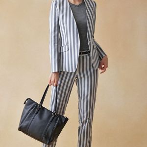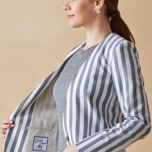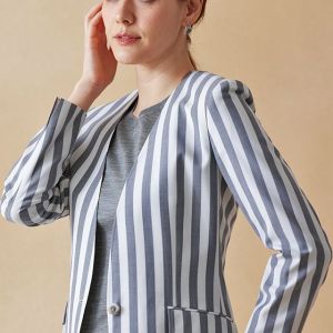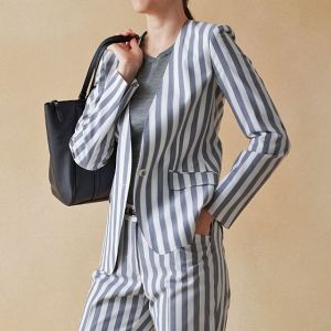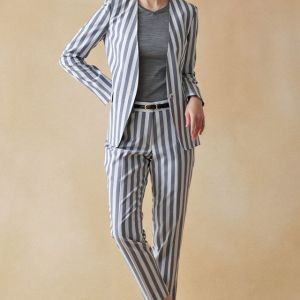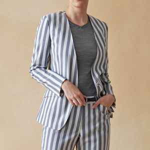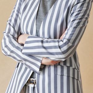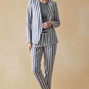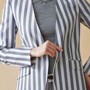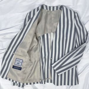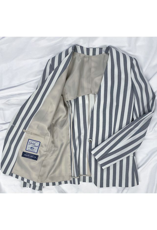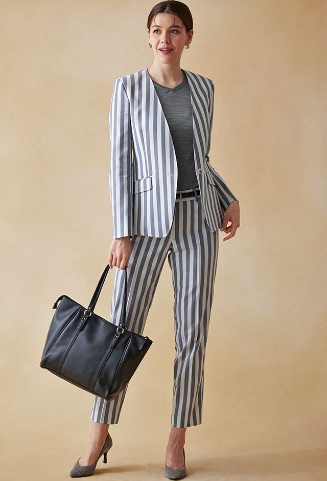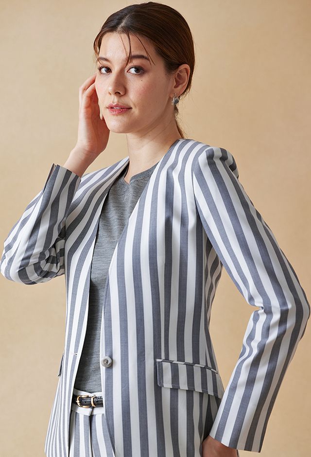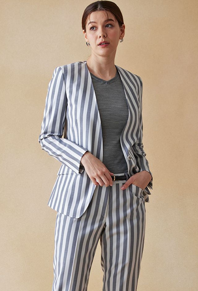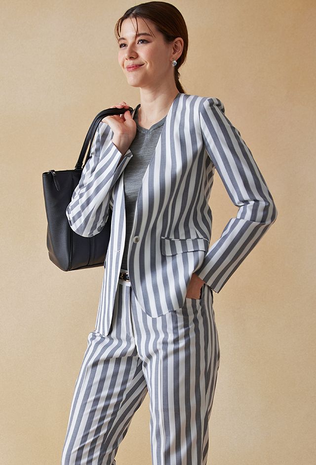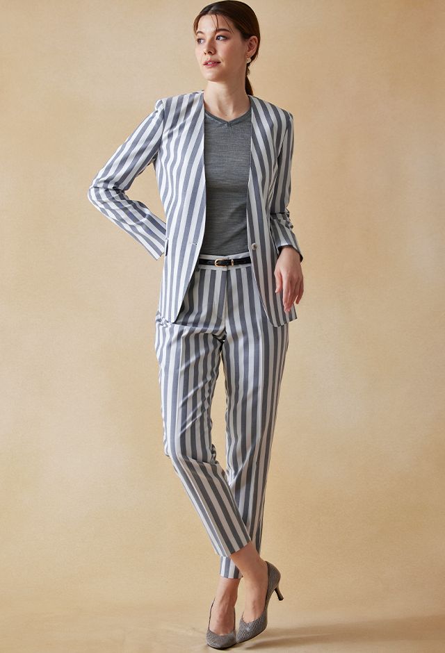 ストレッチ性の高い生地が大好評のイタリアブランド「トラバルド・トーニャ」で仕立てたスーツです。インパクトのある太めのトライプ柄がお洒落なスタイルで、春夏シーズンの生地になります。ジャケットはノーカラーモデル(ボタン)、ボトムスは人気のテーパードパンツで仕立てました。袖のスリットデザインがシンプルで大人っぽい印象に。同系色のボタンでスーツ柄を際立たせます。ツートンコーディネートでシンプルながらも華やかさを感じられるコーディネートにまとめました。