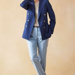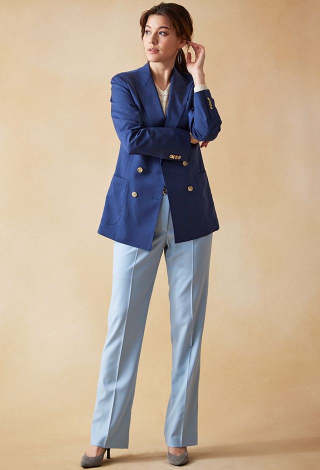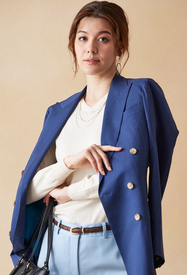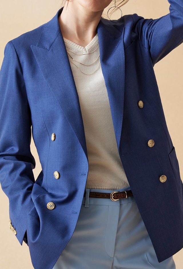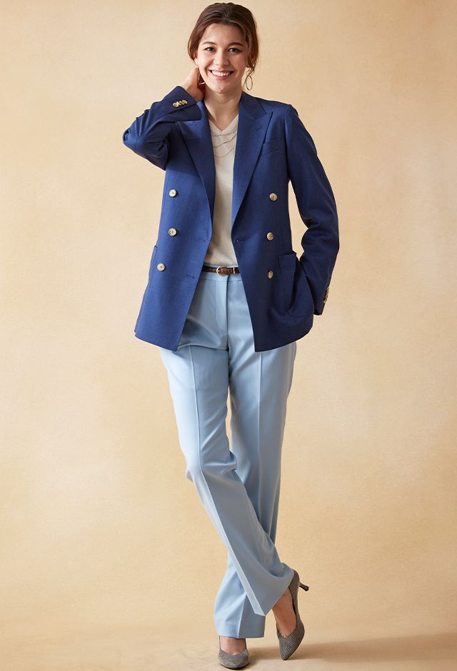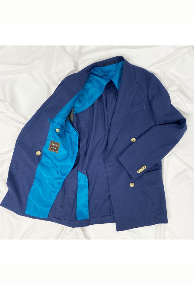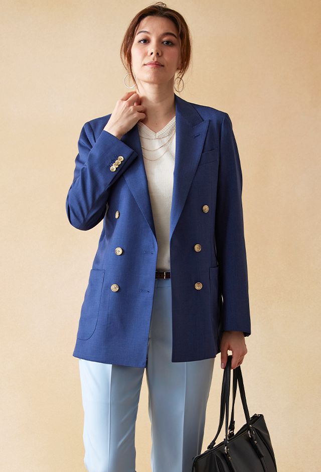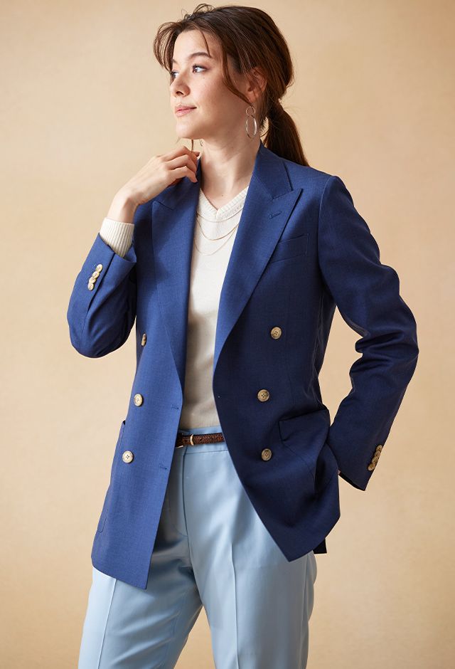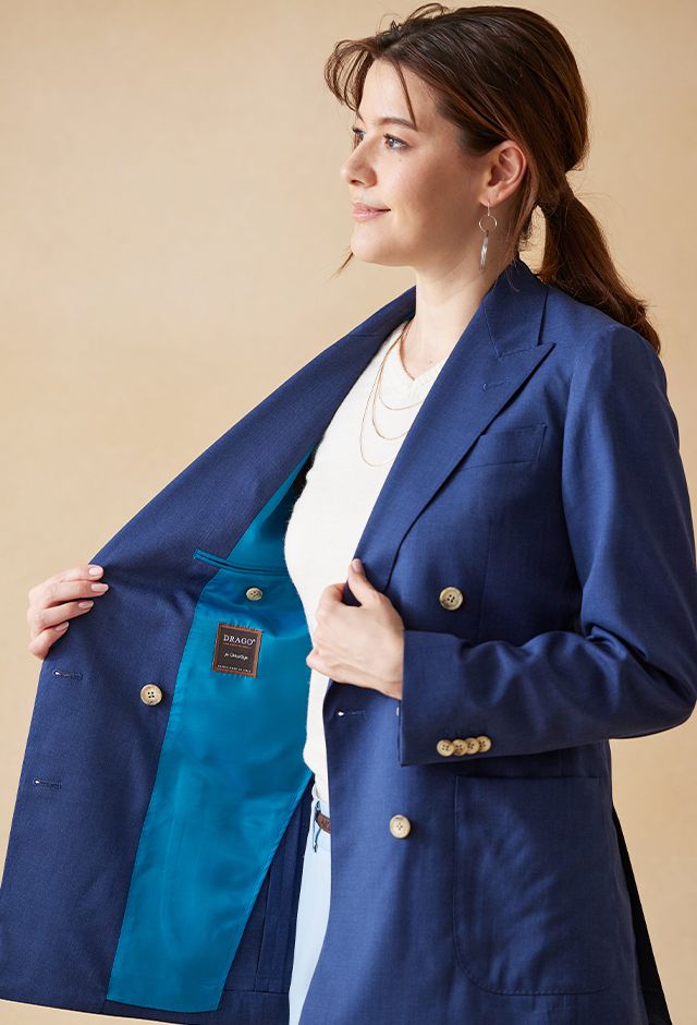 雨が多く多湿な気候を有する市場においても絶大な評価を獲得している「ドラゴ」で仕立てたスーツです。深みのあるブルー×無地のスタイルで、春夏シーズンの生地になります。大人の色気を醸し出す優美なフォルムが特徴のモダンクラシックモデル(ダブル)で仕立てました。アウトポケットをチョイスしオンオフ兼用の着回しのしやすいジャケットデザインに◎ブルー系のジャケットとパンツを合わせた爽やかなカジュアルスーツスタイルに仕上げました。※こちらはメンズのモデルでお仕立てしたスーツになります。