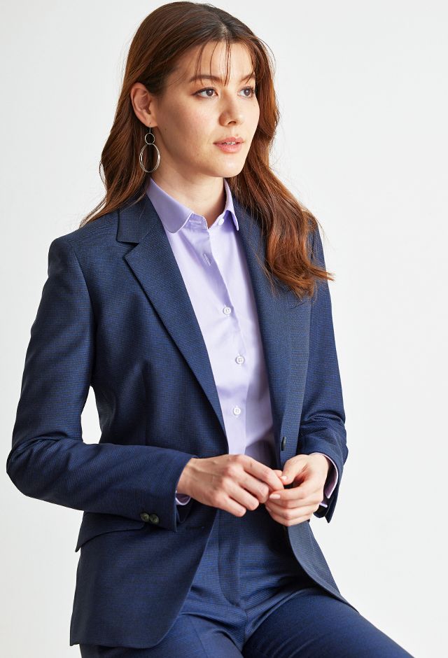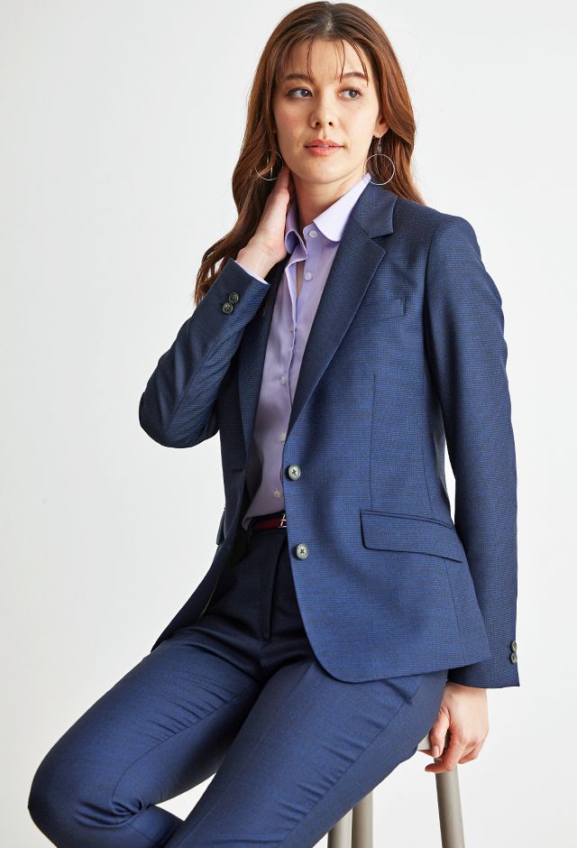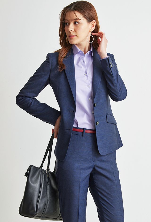 トレンドをふんだんに取り入れたデザイン性が特徴の「マルゾット」で仕立てたスーツです。堅実なイメージのあるネイビーカラー×千鳥格子柄のスタイルで、オールシーズン着用していただけます。ジャケットはテーラーギビングモデル(2つボタン)、ボトムスは人気のテーパードパンツで仕立てました。ジャケットのポケットは斜めにすることでシャープさをプラス。同系色のボタンでシンプルなディテールに。アクセントカラーでレッドのベルトを入れメリハリと軽やかさを演出しました。