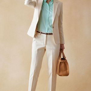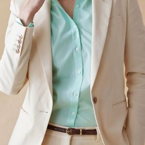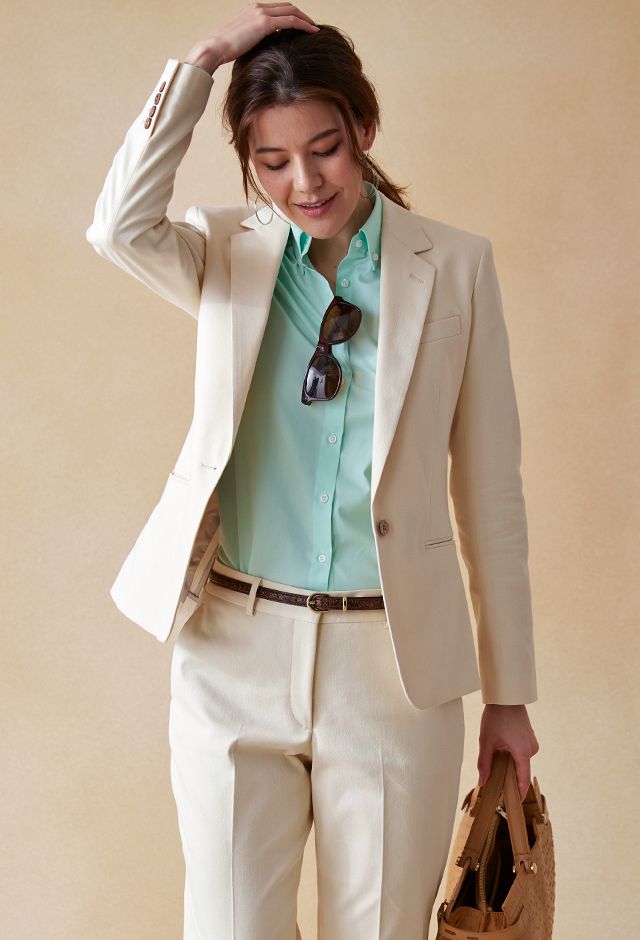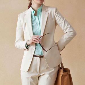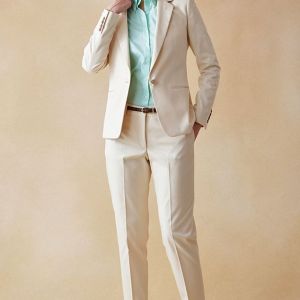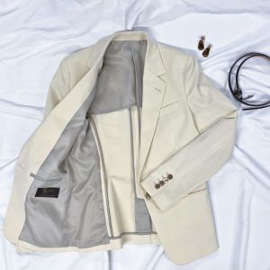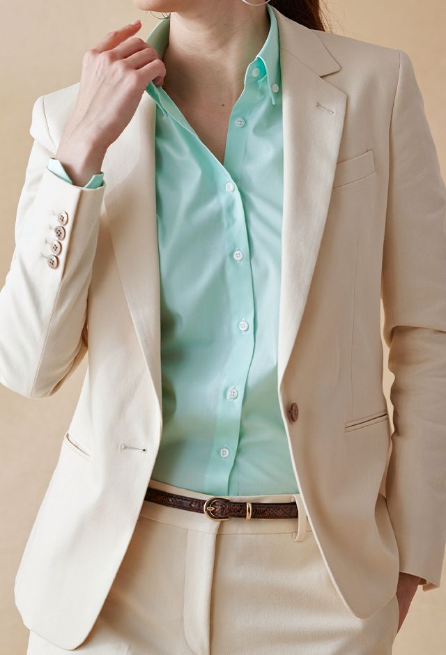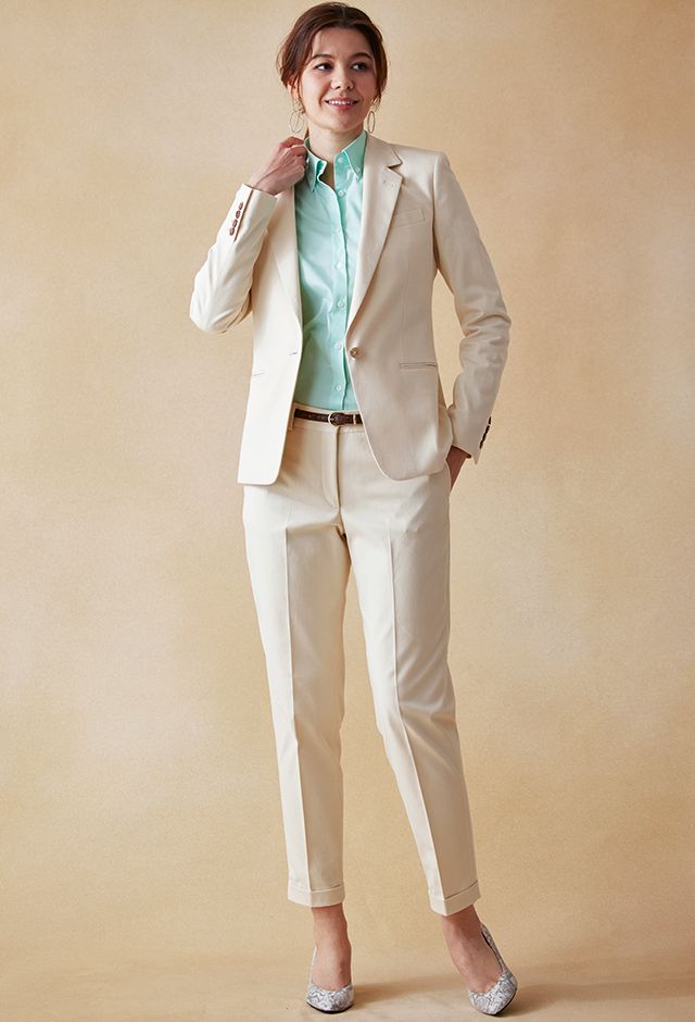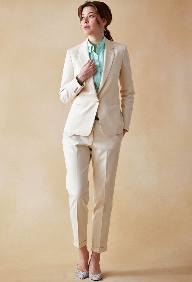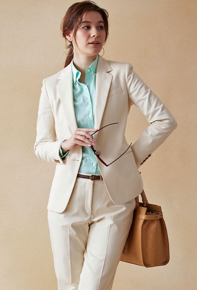 コットン系素材のバリエーションが豊富で、ファンシーなものや特徴的な柄ものを得意とする「ソンドリオ」で仕立てたスーツです。上品でスマートな印象を与えるホワイト×無地のスタイルで、オールシーズン着用していただけます。ジャケットはテーラーギビングモデル(1つボタン)、ボトムスは人気のテーパードパンツで仕立てました。ジャケットの襟には、オプションのラペル穴を採用。ピンバッジなどの着用がスムーズになります。パステルカラーのシャツでホワイトカラーが引き立つコーデに。