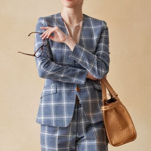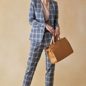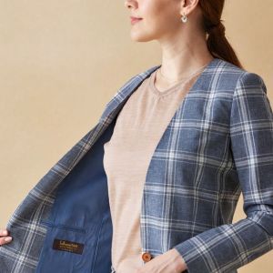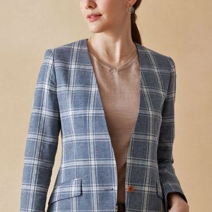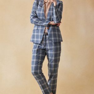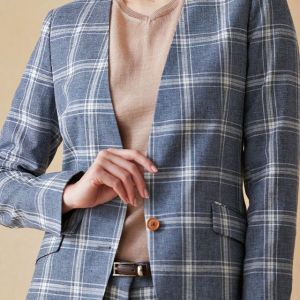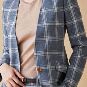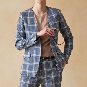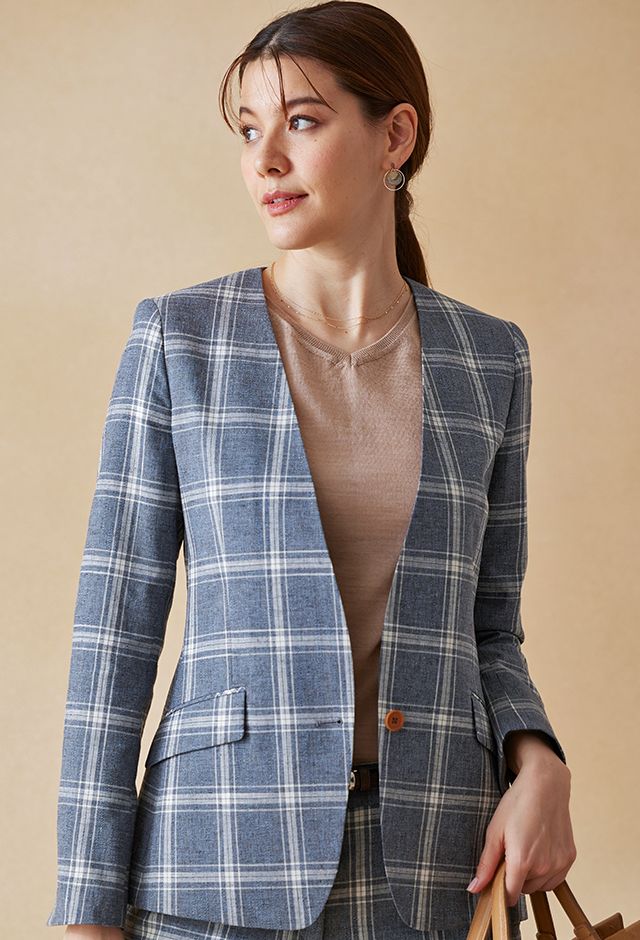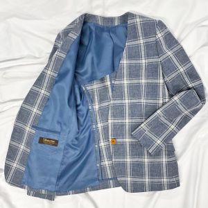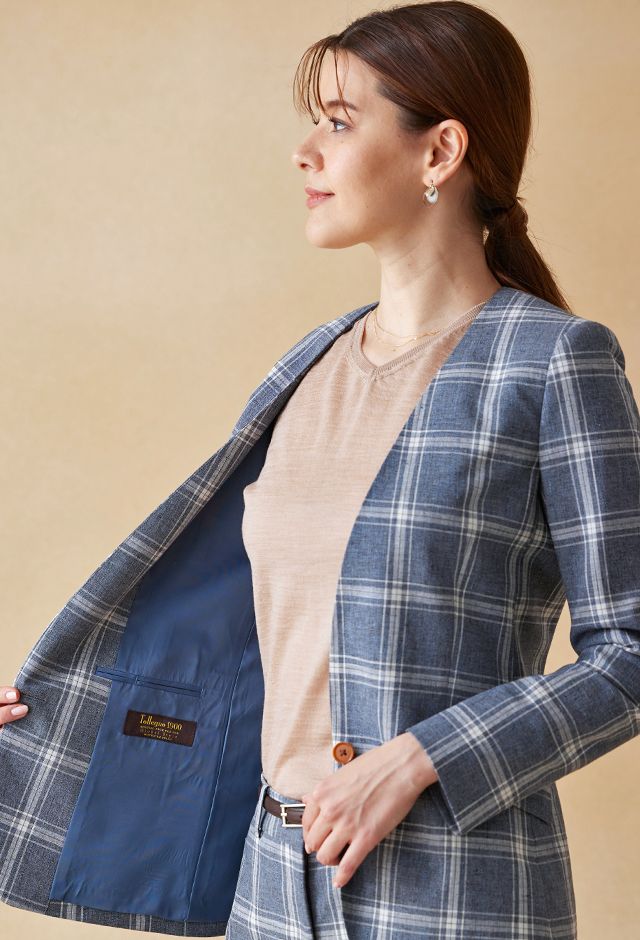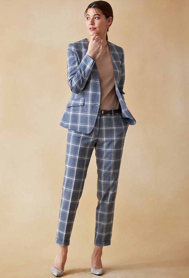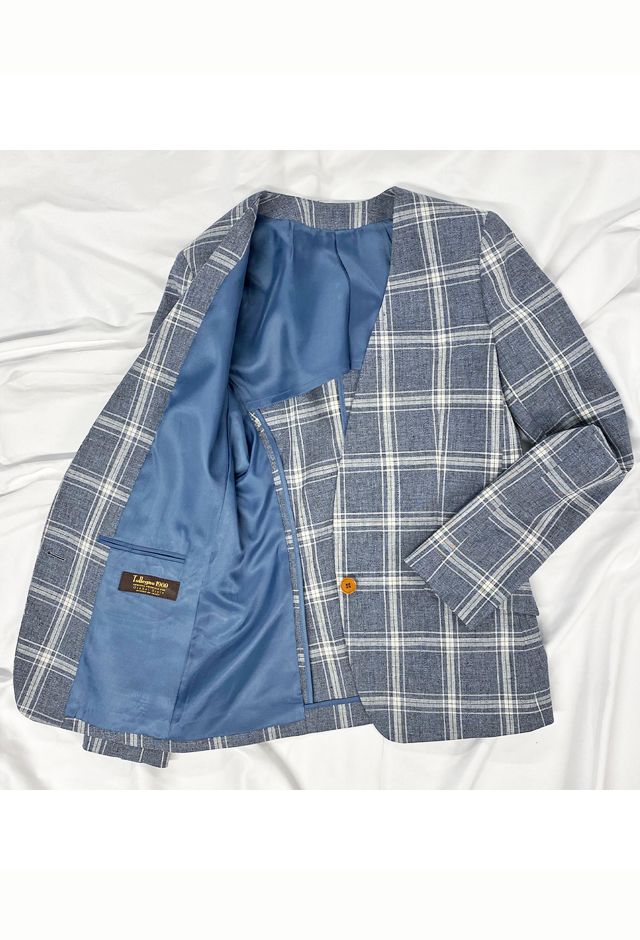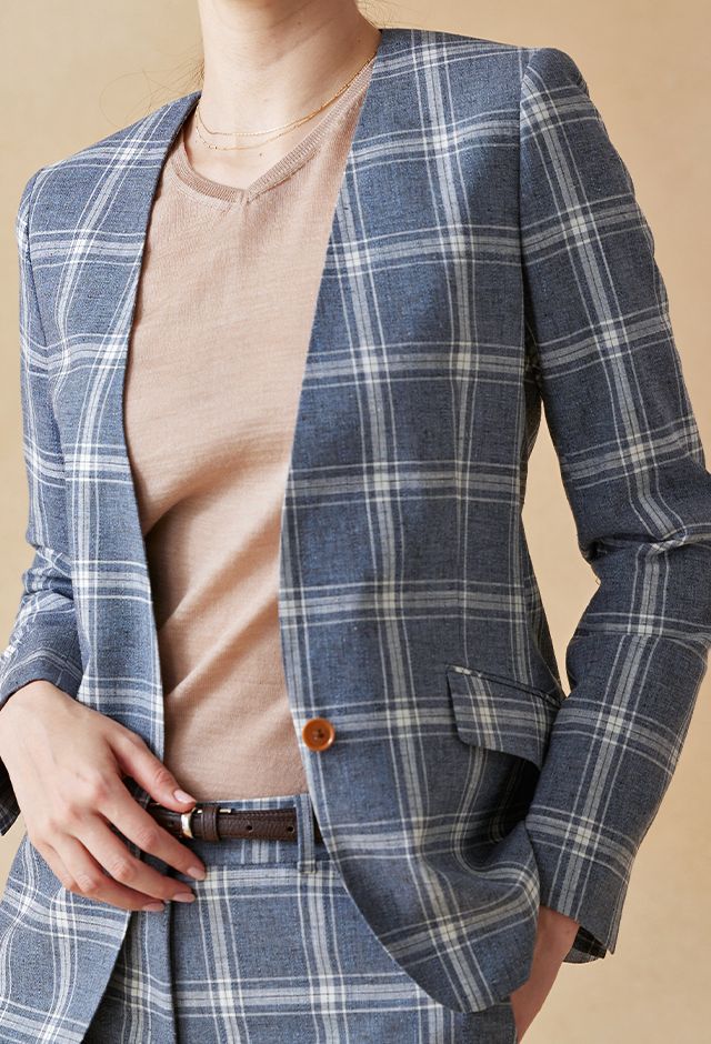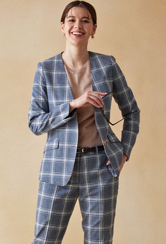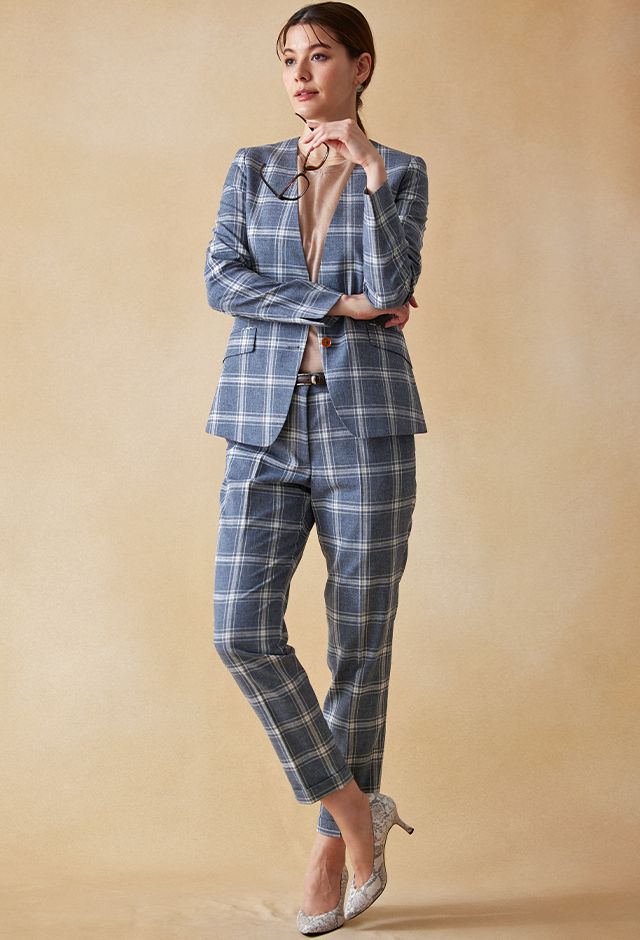 コストパフォーマンスの高さからも人気の高い「トレーニョ」で仕立てたスーツです。さわやかな印象の中にお洒落感のあるブルーグレー×チェックのスタイルで、春夏シーズンの生地になります。ジャケットはノーカラーモデル(ボタン)、ボトムスは人気のテーパードパンツで仕立てました。ライトブラウンのナットボタンを差し色に使用することでカジュアルな印象に。ライトな色合いのアイテムと合わせて軽やかで親しみやすいコーディネートに仕上げました。