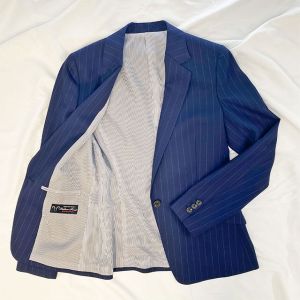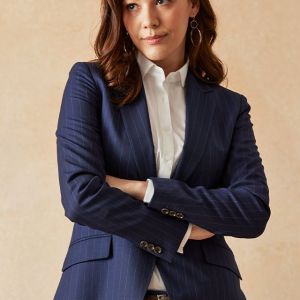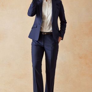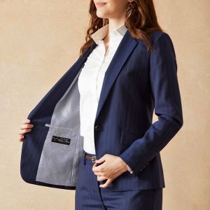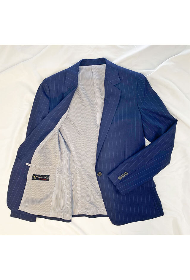 イタリアのノウハウを採用し、コストパフォーマンスに優れた「ビエラフィニッシュ」で仕立てたスーツです。堅実なイメージのあるネイビー×ストライプのスタイルで、オールシーズン着用していただけます。ジャケットはテーラーギビングモデル(1つボタン)、ボトムスはクールなセミフレアパンツで仕立てました。全体的にシンプルなディテールをチョイスして、飽きのこないスタイルに。濃いパープルのパンプスを合わせて、大人の魅力を引き出すコーディネートに◎