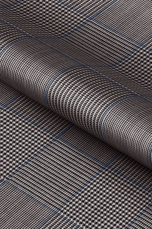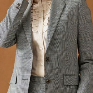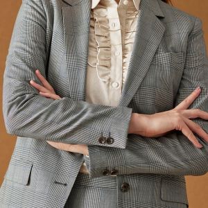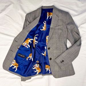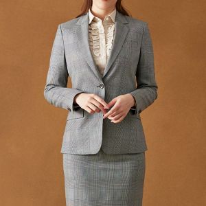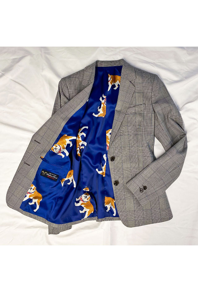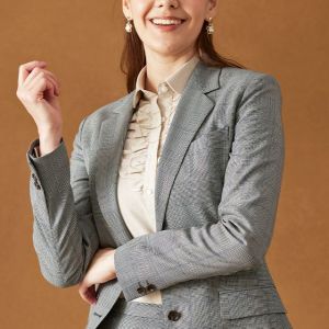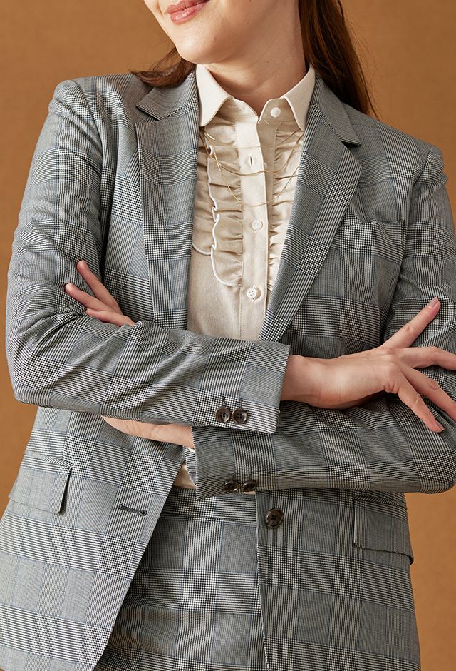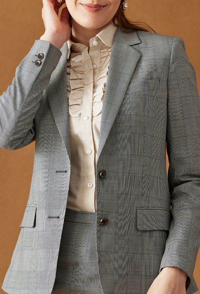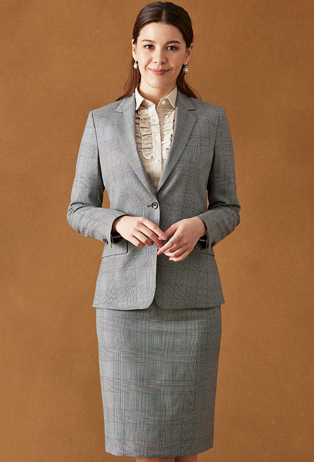 イタリアのノウハウを採用し、コストパフォーマンスに優れた「ビエラフィニッシュ」で仕立てたスーツです。グレーを基調としカジュアルで親しみやすい印象のチェック柄のスタイルで、オールシーズン着用していただけます。ジャケットはテーラーギビングモデル(2つボタン)、ボトムスは定番のタイトスカートで仕立てました。チラリと見える裏地にはブルドッグ柄を採用して、個性あふれるデザインに。インナーにフリル付きのシャツを合わせて、女性らしい華やかさを演出しました。