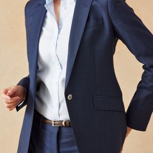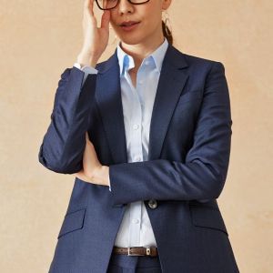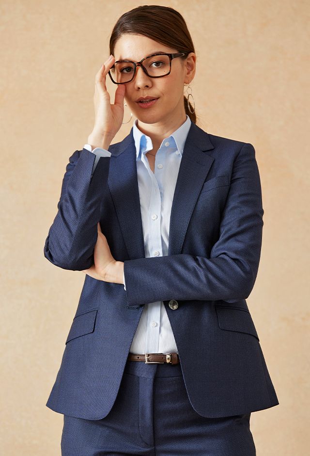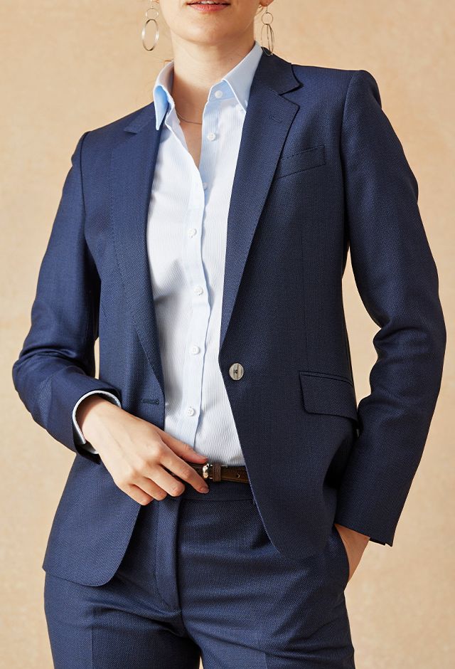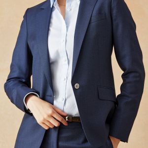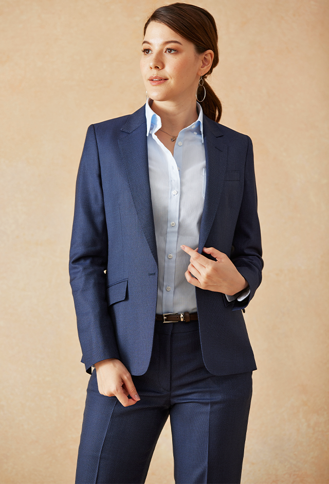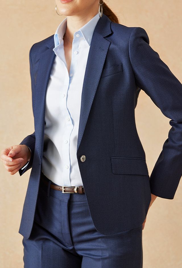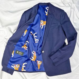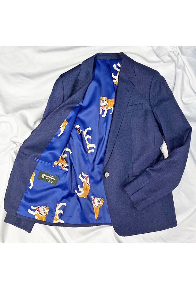 80ケ国以上にファンを持つ世界的なイギリスブランド「ドーメル」で仕立てたスーツです。ビジネスの場で最も適した色であるネイビーバーズアイのスタイルで、オールシーズン着用していただけます。ジャケットはテーラーギビングモデル(1つボタン)、ボトムスはクールなセミフレアパンツで仕立てました。ダークトーンのボタンでビジネスシーンに適した洗練された印象で、ブルドッグ柄の裏地が話題作りにも最適◎ライトブルーのシャツとの組み合わせが、全体のコーディネートに明るさと清潔感をプラス。