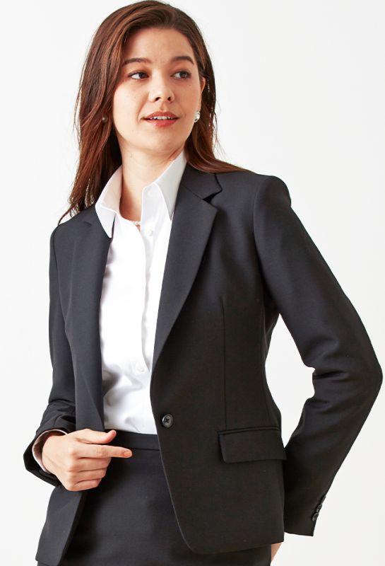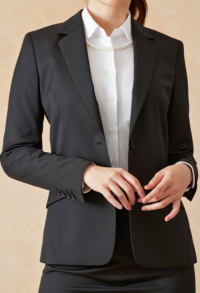 インポートブランドに引けを取らない繊細で柔らかなタッチが印象的なグローバルスタイルオリジナルの「Super 100's」で仕立てたスーツです。シンプルで洗練されたブラックのスタイルで、オールシーズン着用していただけます。ジャケットはテーラーギビングモデル(2つボタン)、ボトムスは定番のタイトスカートで仕立てました。ポケットは斜め(スラント)でシャープに。パールのアクセサリーとドットのストッキング、あえて明るいパンプスを合わせることで少しの個性とフェミニンな要素をプラスしました。
