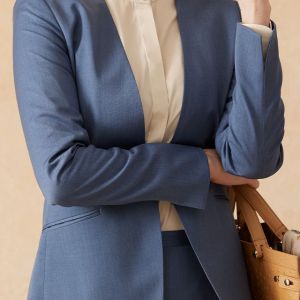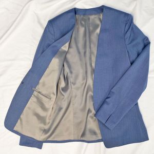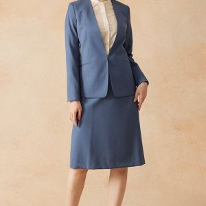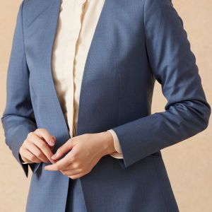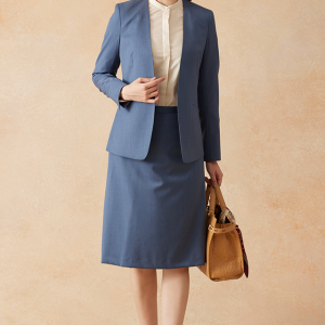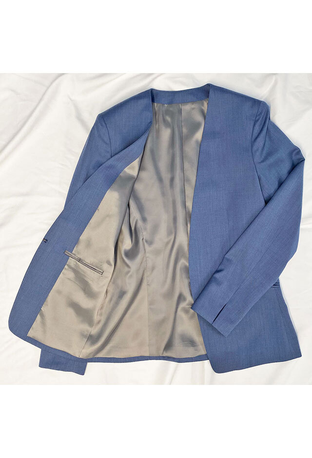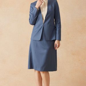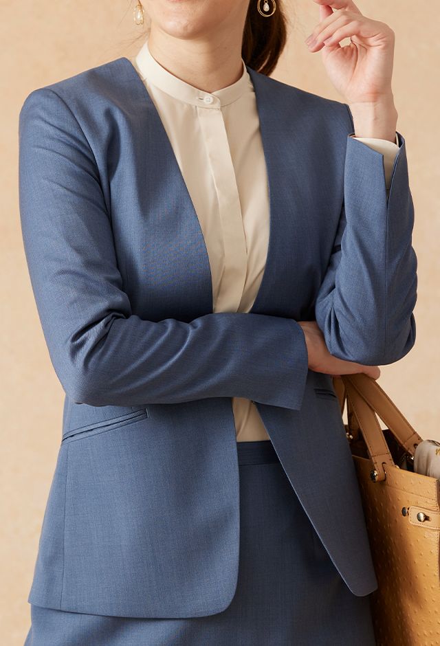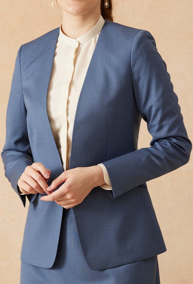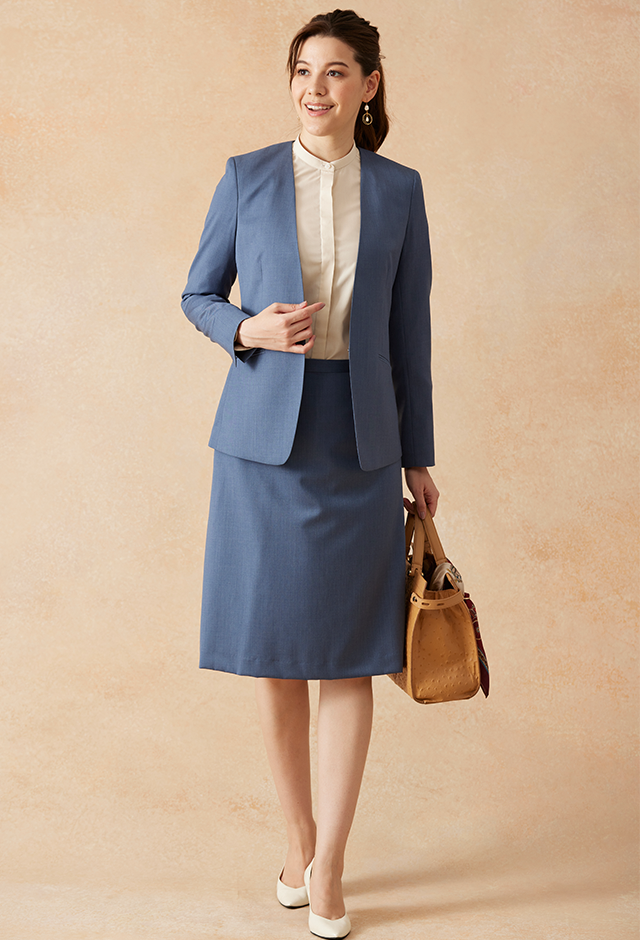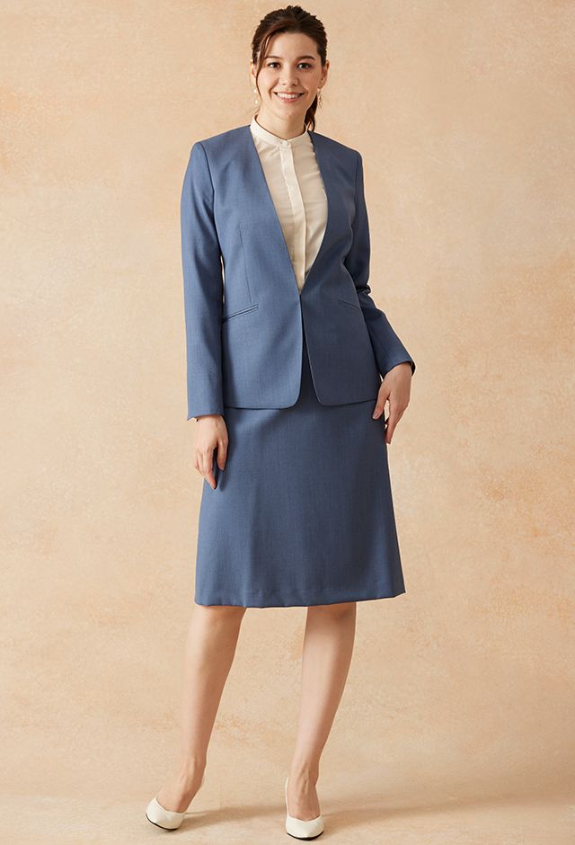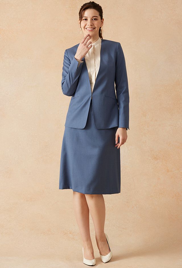 インポートブランドに引けを取らない繊細で柔らかなタッチが印象的なグローバルスタイルオリジナルの「Super 100's」で仕立てたスーツです。特徴的なブルーグレーのスタイルで、オールシーズン着用していただけます。ジャケットはノーカラーモデル(ホック)、ボトムスは程よいフレア加減で着回しやすい定番のフレアスカートで仕立てました。ジャケットは、袖口にボタン無しでスリットが入ったデザインや、ホックを採用したことで全体的にスッキリとした印象を持たせます。ホワイトのパンプスと合わせて清潔感のあるコーデに◎