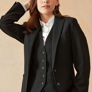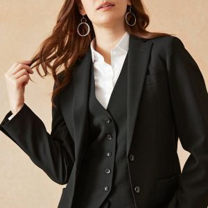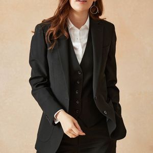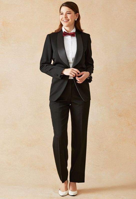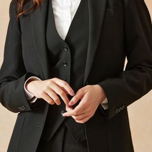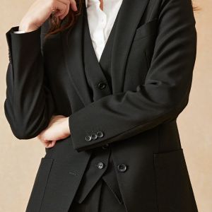 全て国産で作られた品のある生地感が特徴の「THE BLACK」で仕立てたスーツです。シックで洗練された印象のブラックのスタイルで、オールシーズン着用していただけます。肩パットや芯地を極力排したアンコンモデルでジャケットを仕立てました。ベストを追加することで、全体のコーディネートに深みと重厚感が加わります。上品で統一感のあるモノトーンスーツコーデに、パープルのパンプスでアクセントを加え、今人気のジェンダーレスな一着に。※こちらはメンズのモデルでお仕立てしたスーツになります。