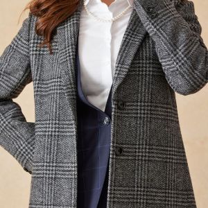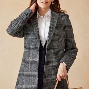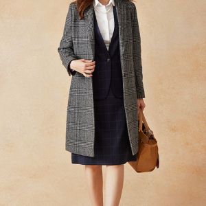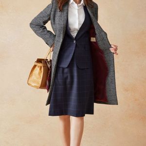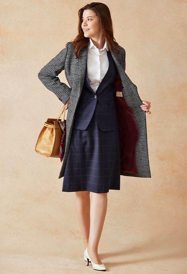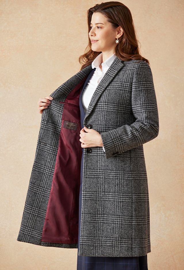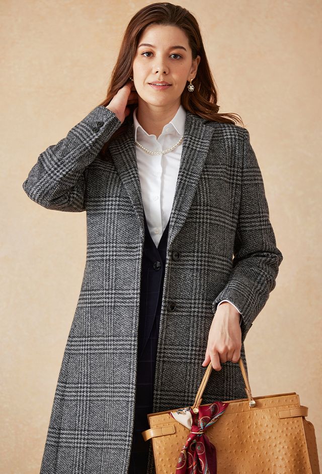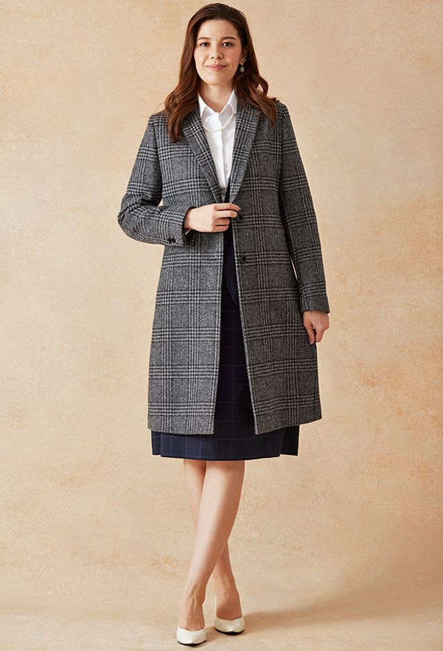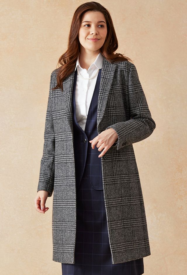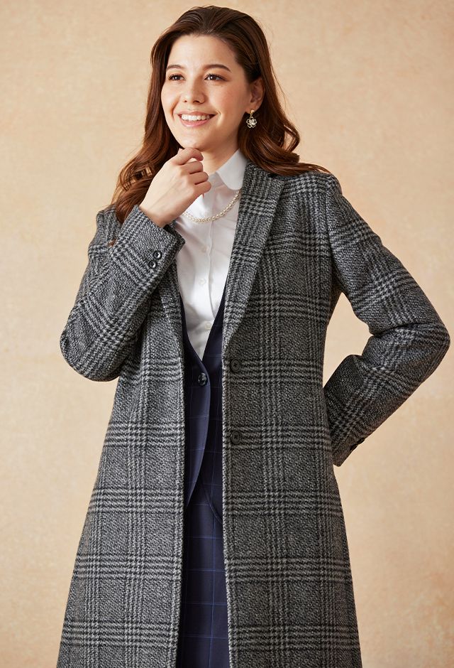 高品質でコストパフォーマンスに優れたイタリアブランド「カノニコ」で仕立てたコートです。クラシックでありながらモダンな印象を与えるグレー×チェックのスタイルで、上品でありながらカジュアルにも合わせることができる歴史のあるチェスターコートモデルに仕立てました。ボタンにはダークトーンのボタンを合わせて、コートの柄を際立たせ、ポケットはフラップ(ふた)無しで腰回りをスッキリとさせました。パンツでもスカートでも合わせやすい一着です。