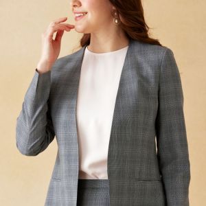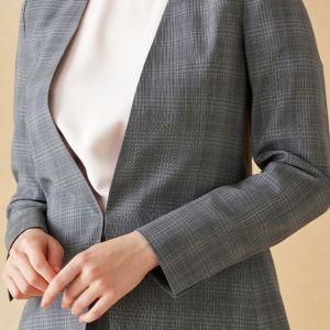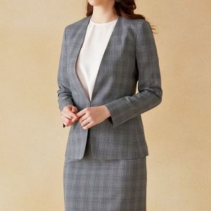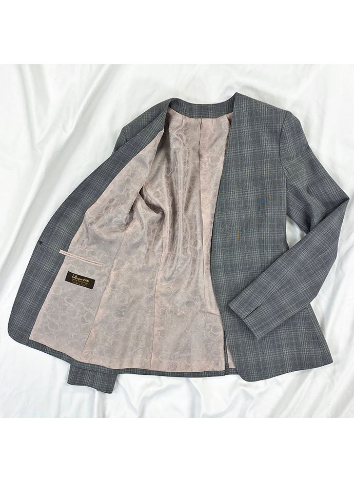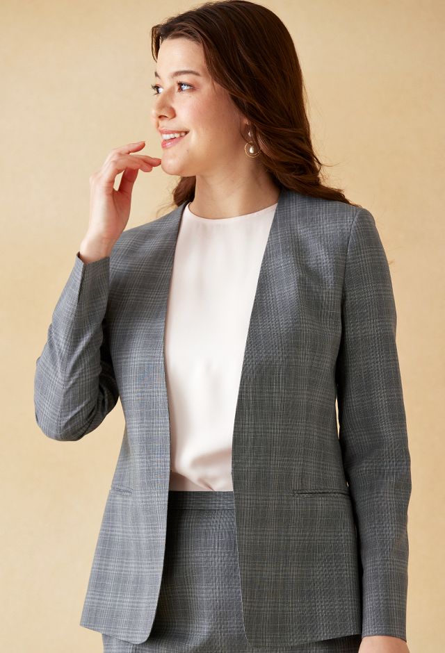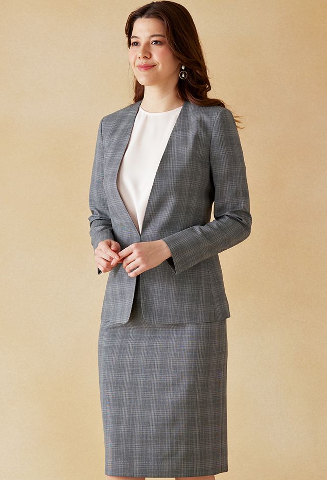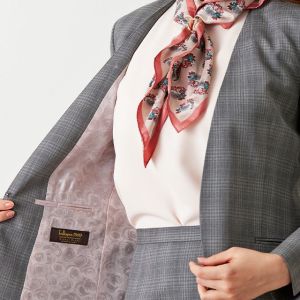 コストパフォーマンスの高さからも人気の高い「トレーニョ」で仕立てたスーツです。ビジネスシーンにも適しながら、堅すぎない柔らかな雰囲気を醸しだすライトグレーチェックのスタイルで、春夏シーズンの生地になります。ジャケットはノーカラーモデル(ホック)、ボトムスは定番のタイトスカートで仕立てました。華やかで洗練された印象を与えるバラ柄の裏地をチョイス。ピンク系のブラウスとスカーフの組み合わせが、女性らしく優しい印象をプラスします。