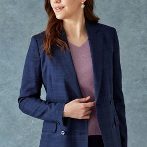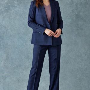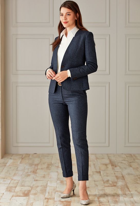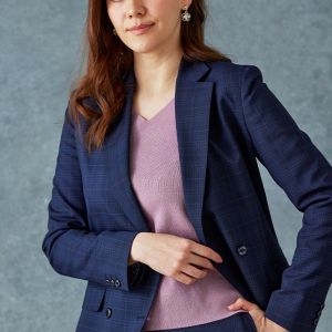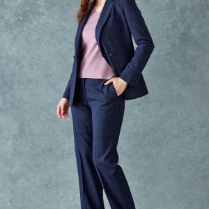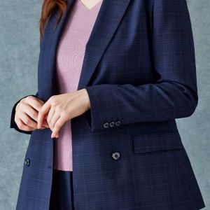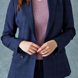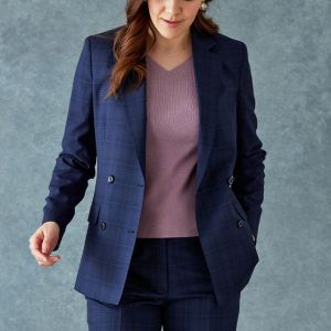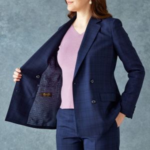 コストパフォーマンスの高さからも人気の高い「トレーニョ」で仕立てたスーツです。ネイビーをベースにした落ち着いたチェックのスタイルで、春夏シーズンの生地になります。女性らしい優美なラインを演出しながら、スマートな雰囲気を出せるダブルジャケットで仕立てました。同系色のボタンとブルーの花柄裏地をチョイスし、統一感のあるデザインに。シルエットが高級感を演出し、ピンクのインナーが女性らしい柔らかさをプラス。さまざまなシーンで着用しやすい一着です。
