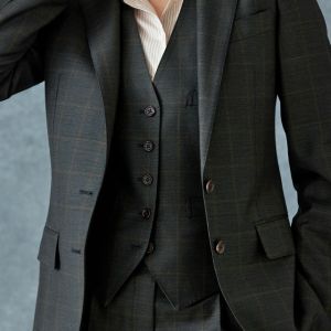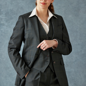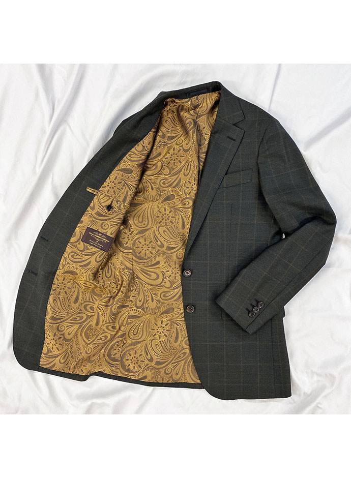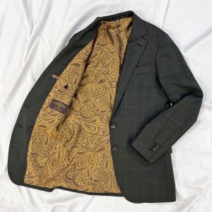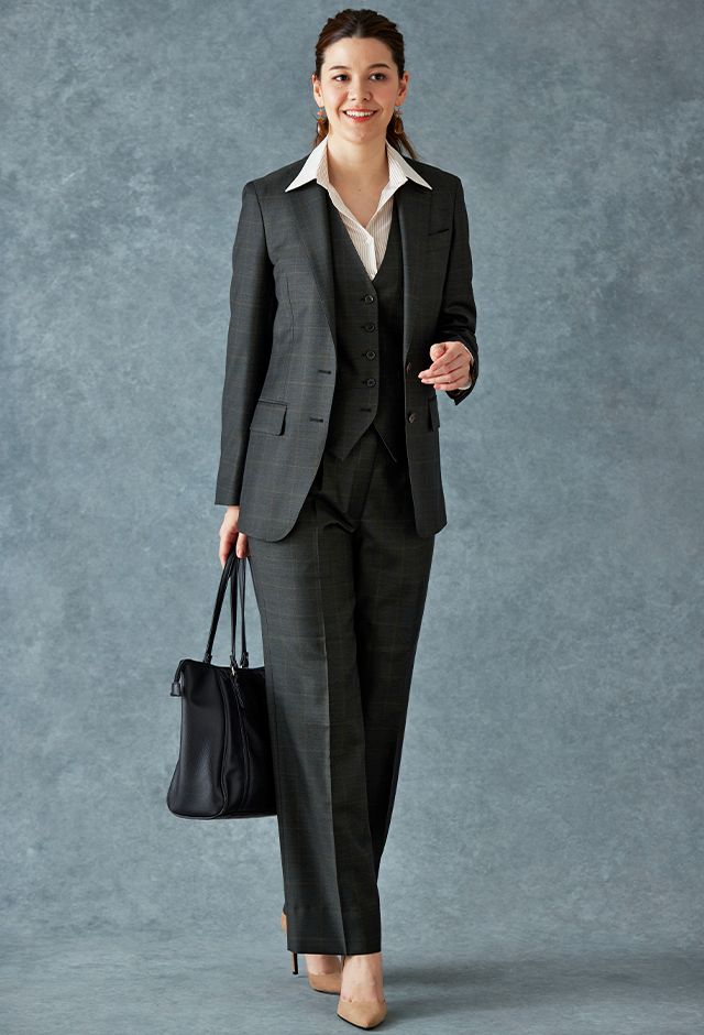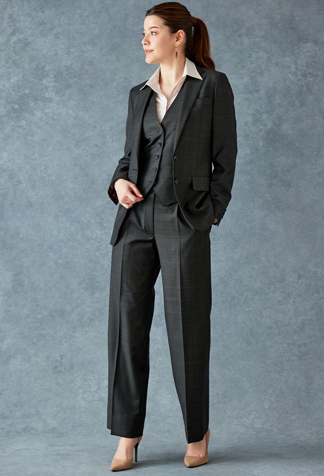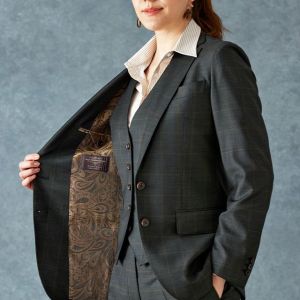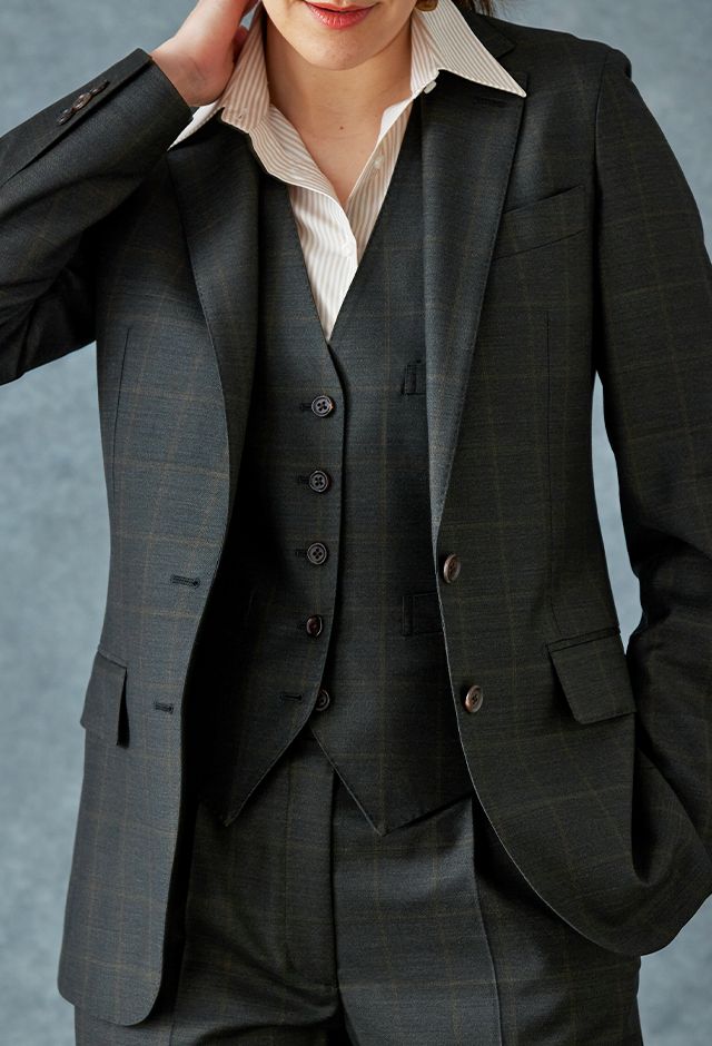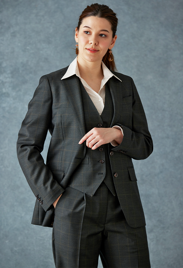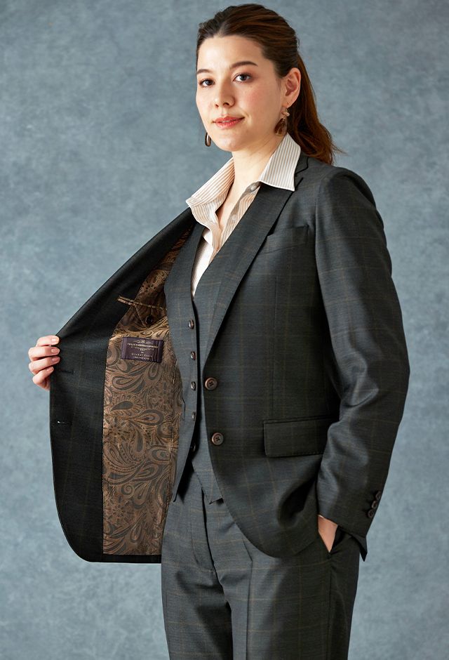 高品質でコストパフォーマンスに優れたイタリアブランド「カノニコ」で仕立てたスーツです。さりげないチェック柄がシンプルながらも奥行きのあるグリーンのスタイルで、オールシーズン着用していただけます。ジャケットはテーラーギビングモデル(2つボタン)、ボトムスはクールなセミフレアパンツで仕立てました。ジャケット、ベスト、パンツの3ピース仕様で、トラディショナルな雰囲気を演出。グリーンと相性の良いブラウンペイズリーの裏地がより存在感をアピール。襟付きのシャツで引き締まった印象に。※こちらはメンズモデルでお仕立てしたスーツになります。パンツはメンズモデルからさらにワイドパンツ風にアレンジしたものになります。
