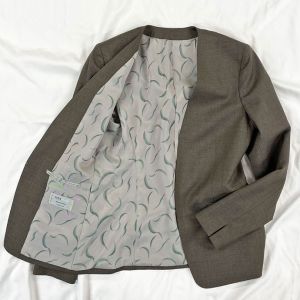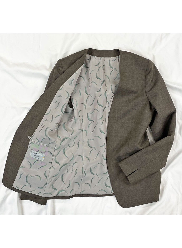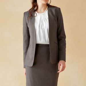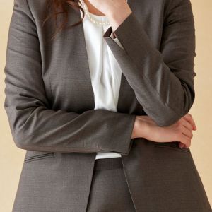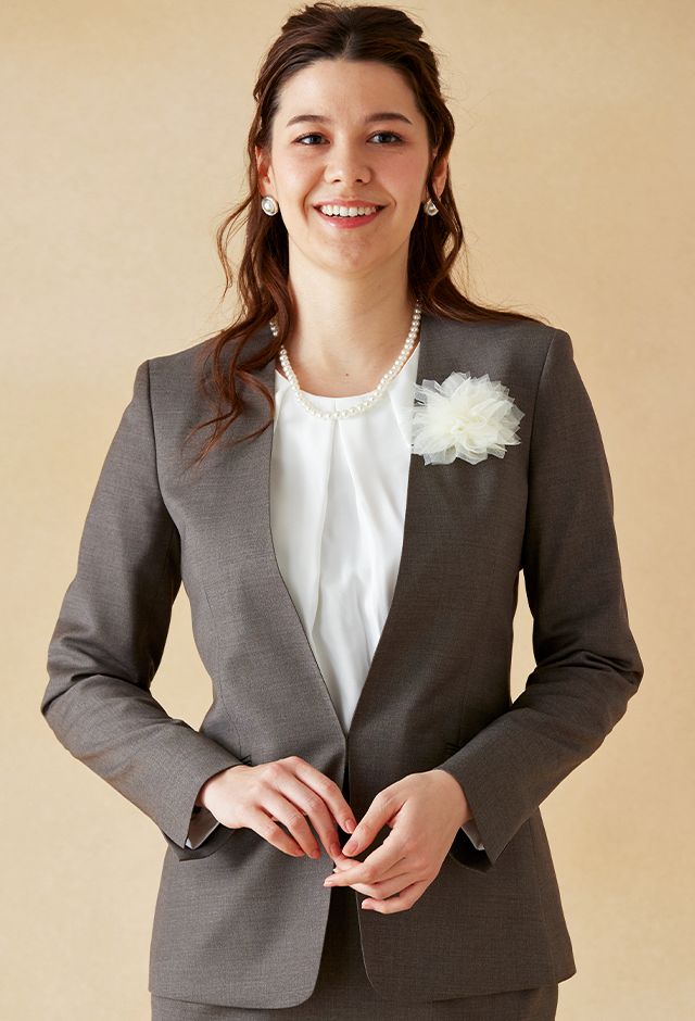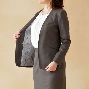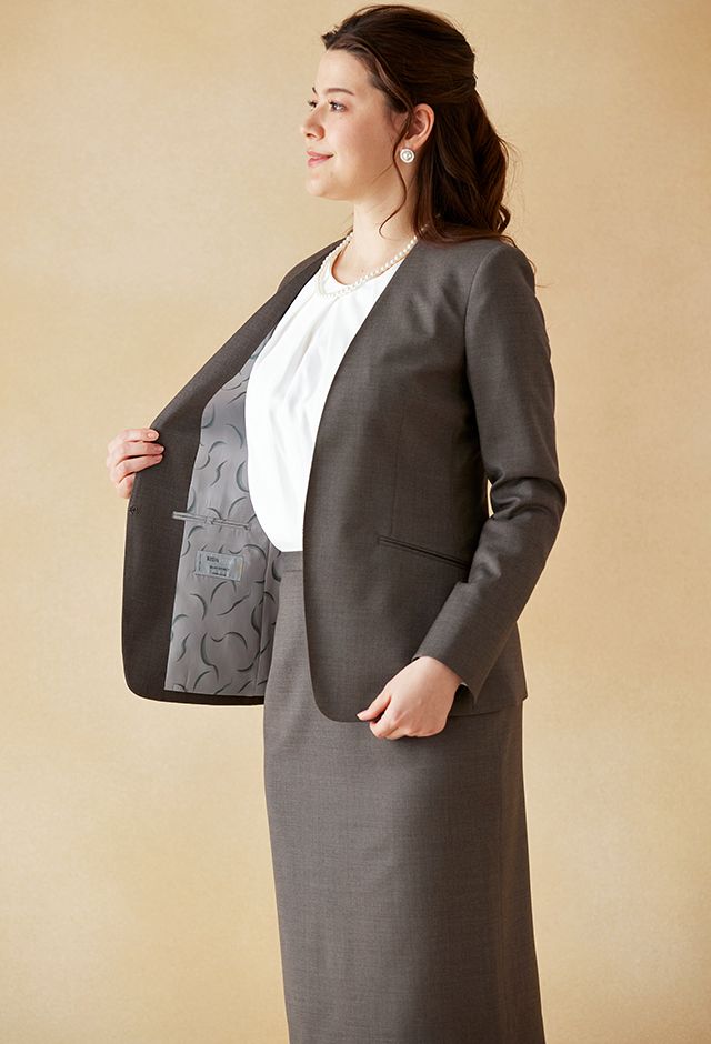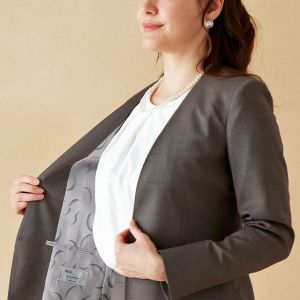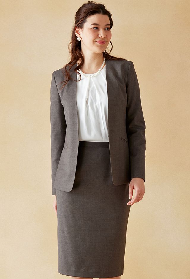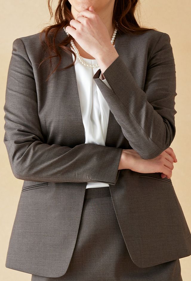 クラシカルからファンシーなデザインまで幅広く生み出すイタリアブランド「レダ」で仕立てたスーツです。ナチュラルで軽やかなベージュカラーのスタイルで、オールシーズン着用していただけます。ジャケットはノーカラーモデル(ホック)、ボトムスは定番のタイトスカートで仕立てました。ポケットは斜め(スラント)で、フラップ無しを採用しスッキリとした印象に。オフホワイトのパンプスを合わせて明るくフォーマルなスタイルに◎普段のビジネスシーンでも着用いただけます。