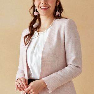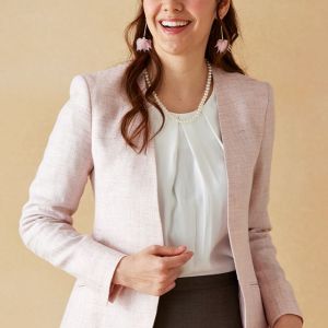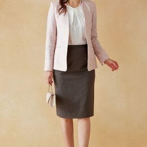 雨が多く多湿な気候を有する市場においても絶大な評価を獲得している「ドラゴ」で仕立てたスーツです。女性らしさと上品なフォーマル感を兼ね備えた淡いピンクのスタイルで、オールシーズン着用していただけます。ジャケットはノーカラーモデル(ホック)、ボトムスは定番のタイトスカートで仕立てました。フラップのないポケットが、シンプルなデザインを際立たせ、生地の上質さを引き立てます。インナーやバッグなどの小物をバランスよくコーディネートすることで、全体の色合いに統一感が生まれ、爽やかで明るい印象を与えます。