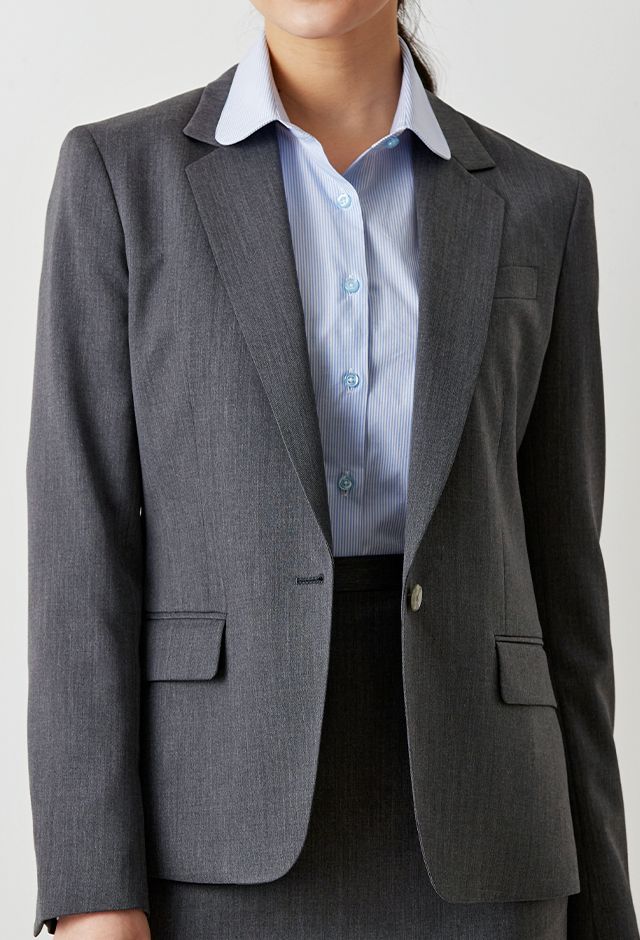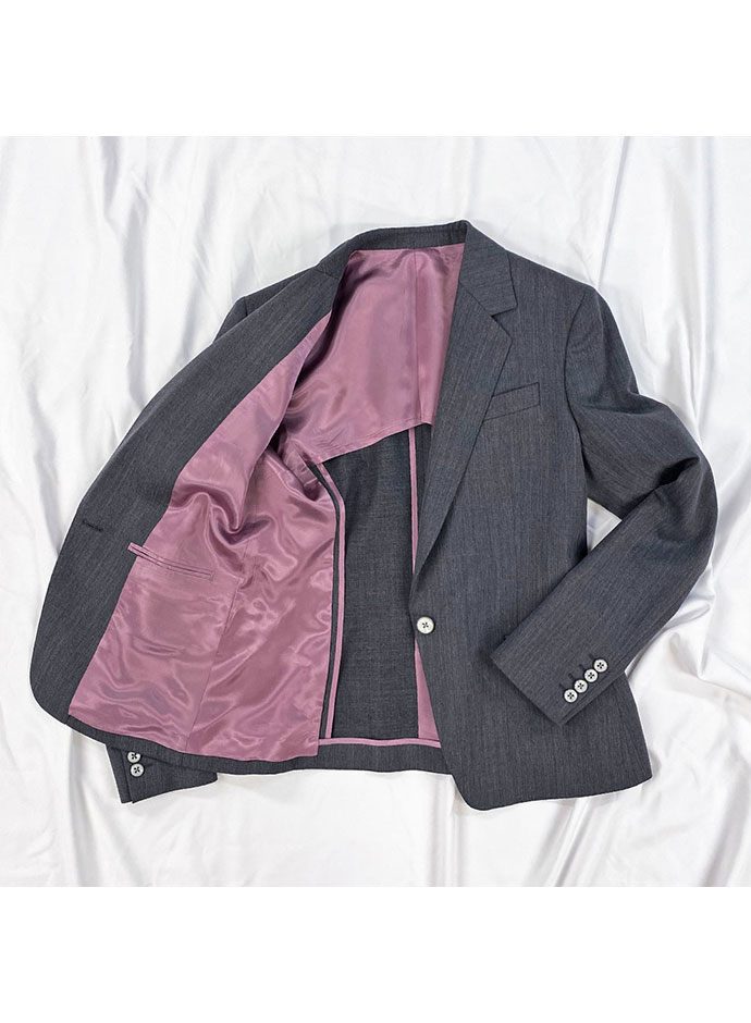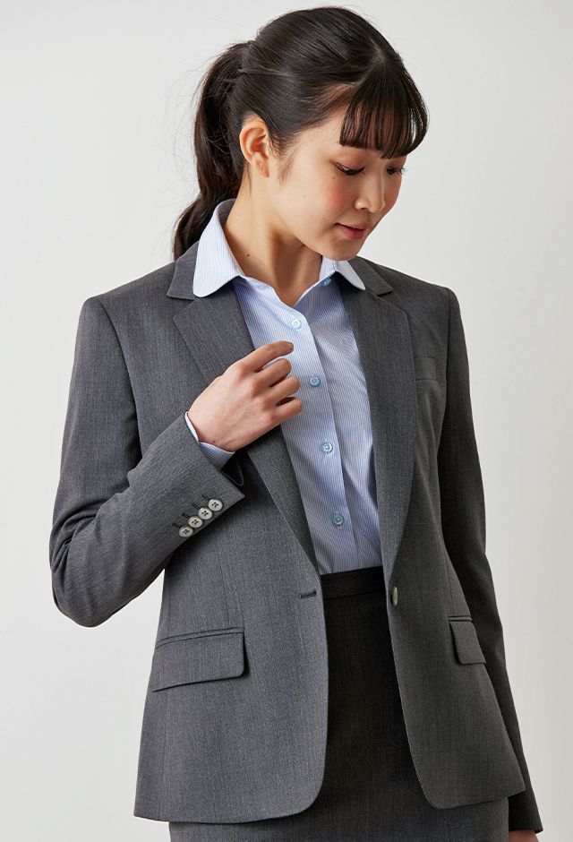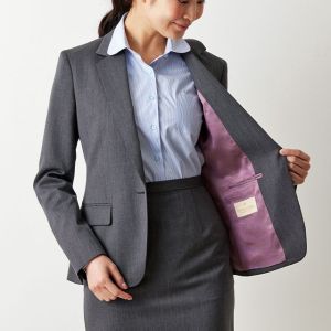 耐久性とコストパフォーマンスに優れた「テクニカル・ウーステッド」で仕立てたスーツです。上品で大人っぽい印象になるグレーのスタイルで、オールシーズン着用していただけます。ジャケットはテーラーギビングモデル(1つボタン)、ボトムスは定番のタイトスカートで仕立てました。ピンクの裏地がさりげないデザイン性があり、シンプルな外観に個性をプラス◎ライトカラーのシャツやパンプスですっきりとした印象を与えます。どんな場面でも活躍する万能なコーデに。