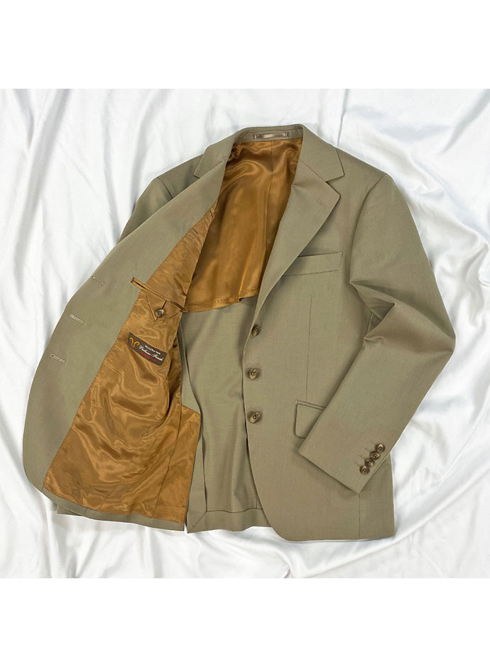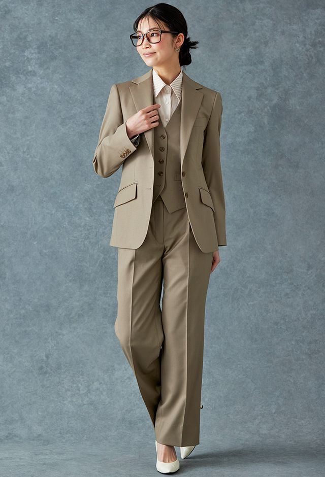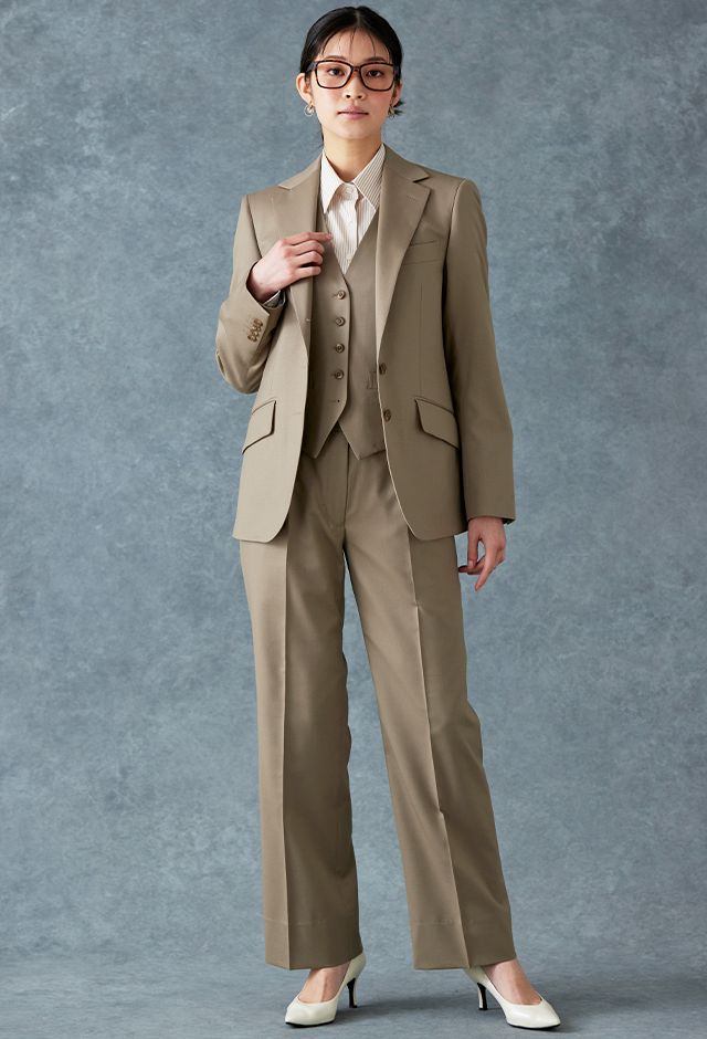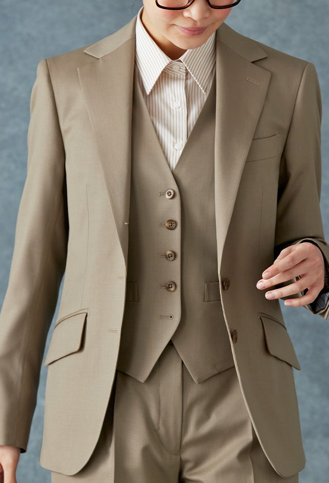 イタリアのノウハウを採用し、コストパフォーマンスに優れた「ビエラフィニッシュ」で仕立てたスーツです。肌なじみがよく、ナチュラルな雰囲気を作り出すベージュのスタイルで、オールシーズン着用していただけます。ジャケットはテーラーギビングモデル(2つボタン)、ボトムスはクールなセミフレアパンツで仕立てました。襟のステッチは入れずに生地の柔らかさを表現しました。ストライプシャツが知的な雰囲気をプラスし、メリハリのある着こなしに。※こちらはメンズのモデルでお仕立てしたスーツになります。