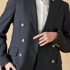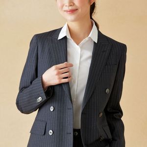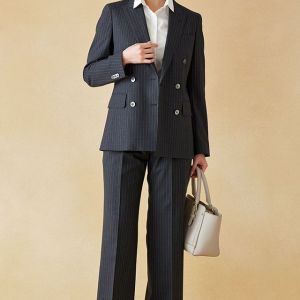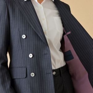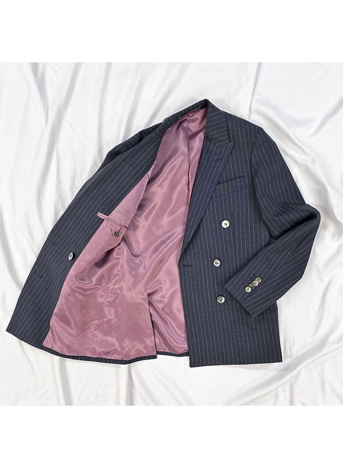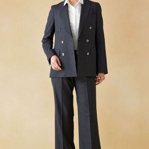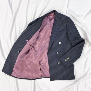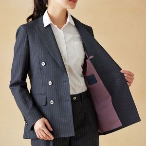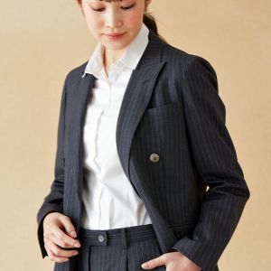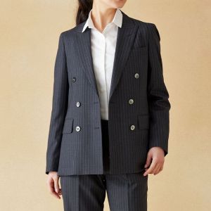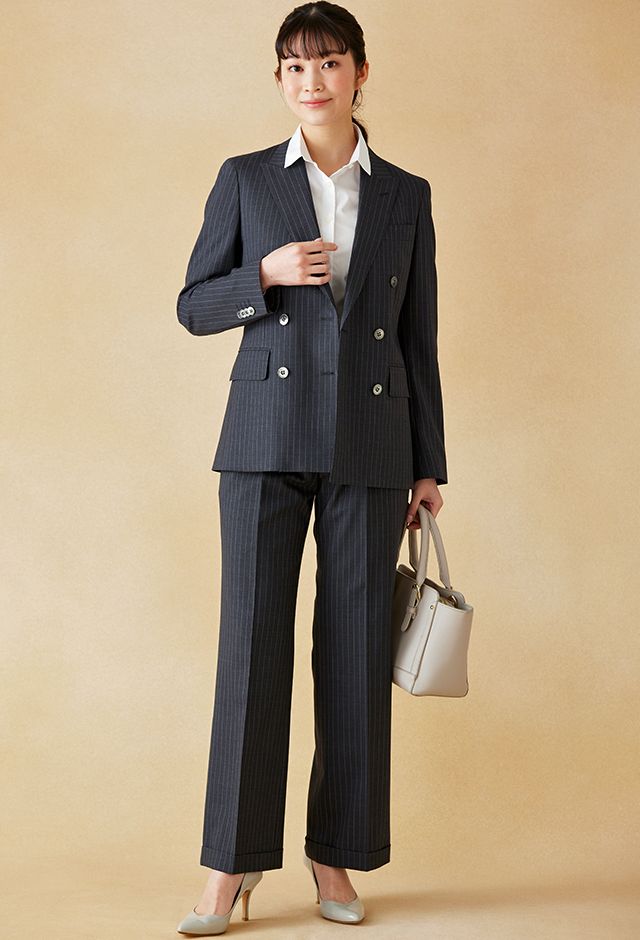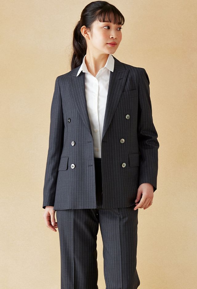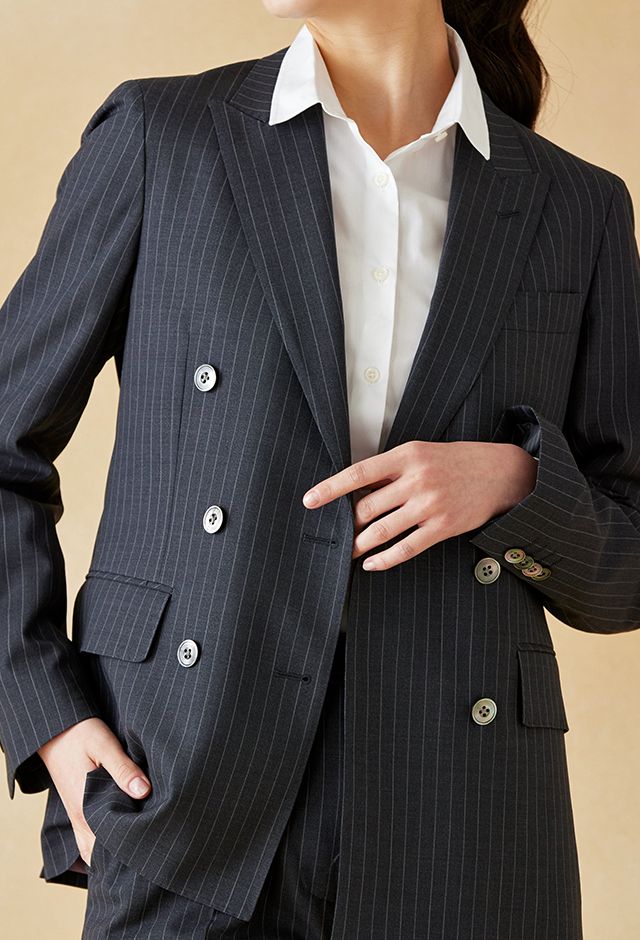 防シワ性やストレッチ性に優れ、出張・外回りの際にも美しいシルエットと着心地を実現できるオリジナルブランド「トラベルウール」で仕立てたスーツです。クラシック感を感じられるグレー×ストライプのスタイルで、春夏シーズンの生地になります。大人の色気を醸し出す優美なフォルムが特徴のモダンクラシックモデル(ダブル)で仕立てました。グレーと相性の良いピンクの裏地で女性らしい雰囲気を演出。パンプスを合わせておしゃれなオフィススタイルにもぴったりのスーツに◎※こちらはメンズのモデルでお仕立てしたスーツになります。