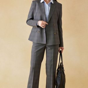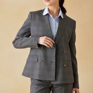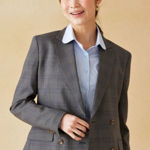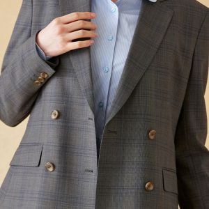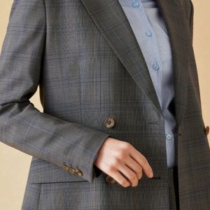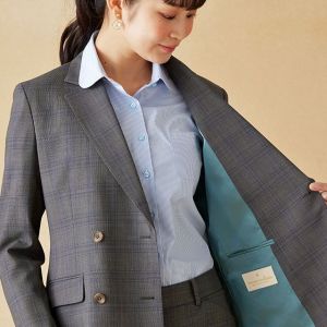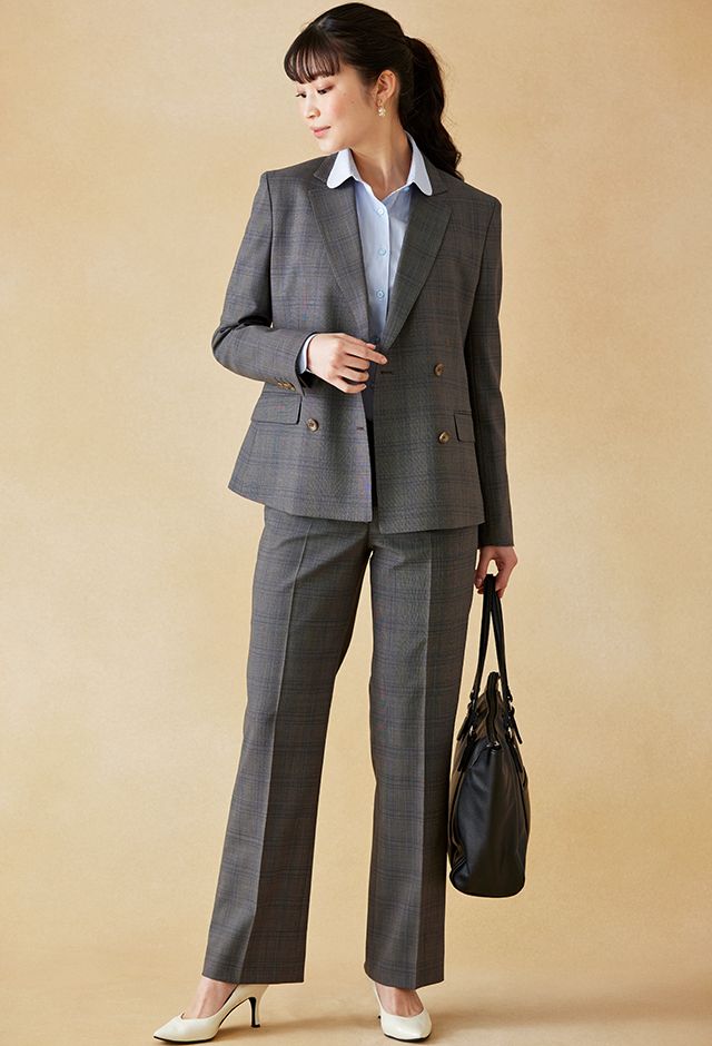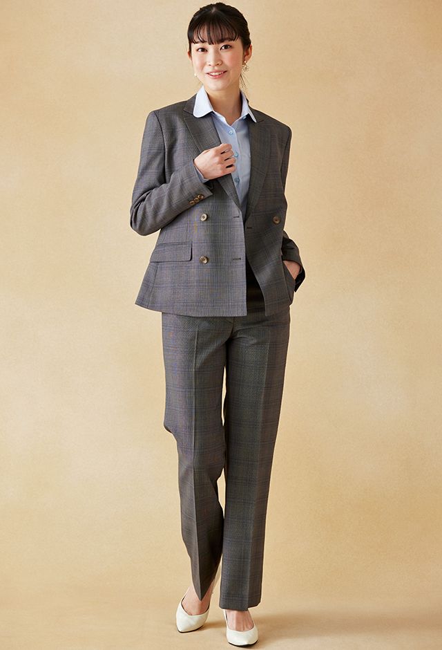 防シワ性やストレッチ性に優れ、出張・外回りの際にも美しいシルエットと着心地を実現できるオリジナルブランド「トラベルウール」で仕立てたスーツです。派手すぎず上品に着こなせるベージュ×チェックのスタイルで、春夏シーズンの生地になります。女性らしい優美なラインを演出しながら、スマートな雰囲気を出せるダブルジャケットで仕立てました。ツヤのあるマーブル調ボタンとラペルに施されたミシンステッチでカジュアルな印象に。ライトブルーのシャツと組み合わせることで、爽やかさをプラスしました。