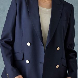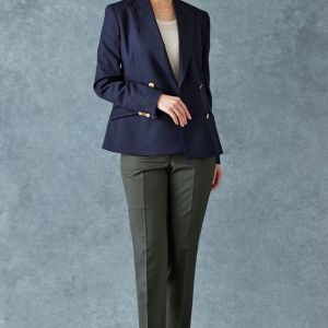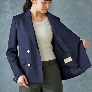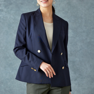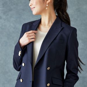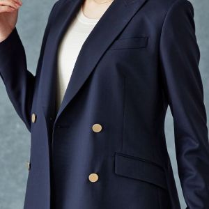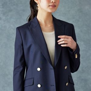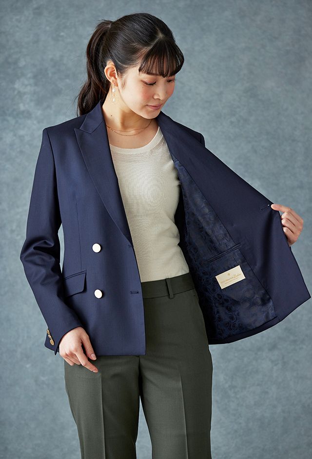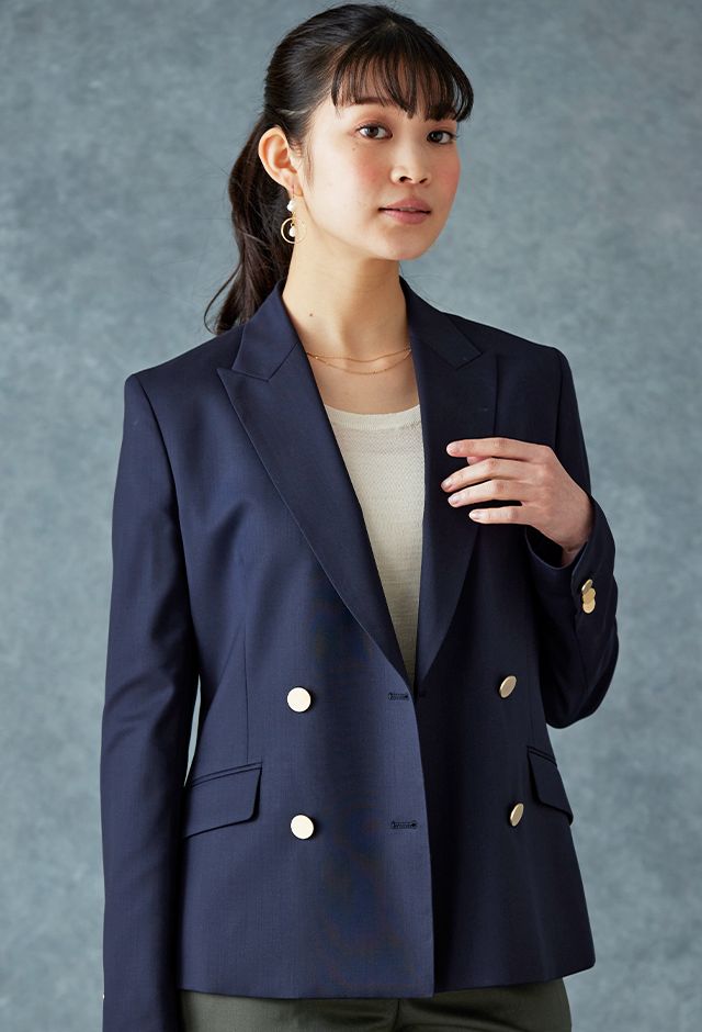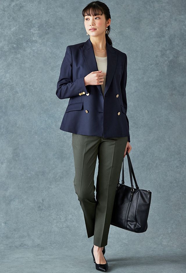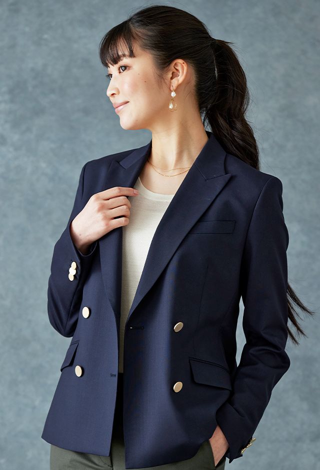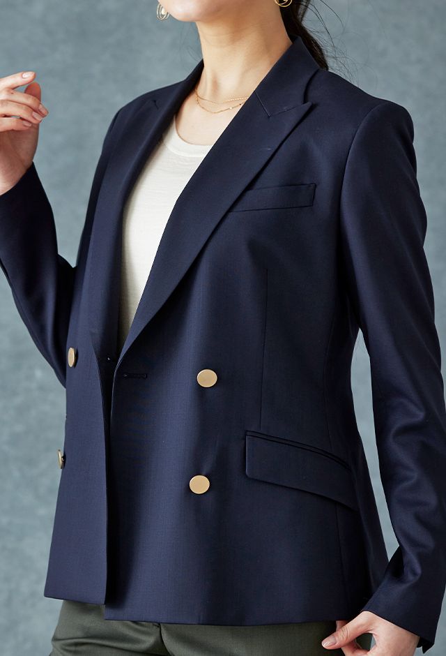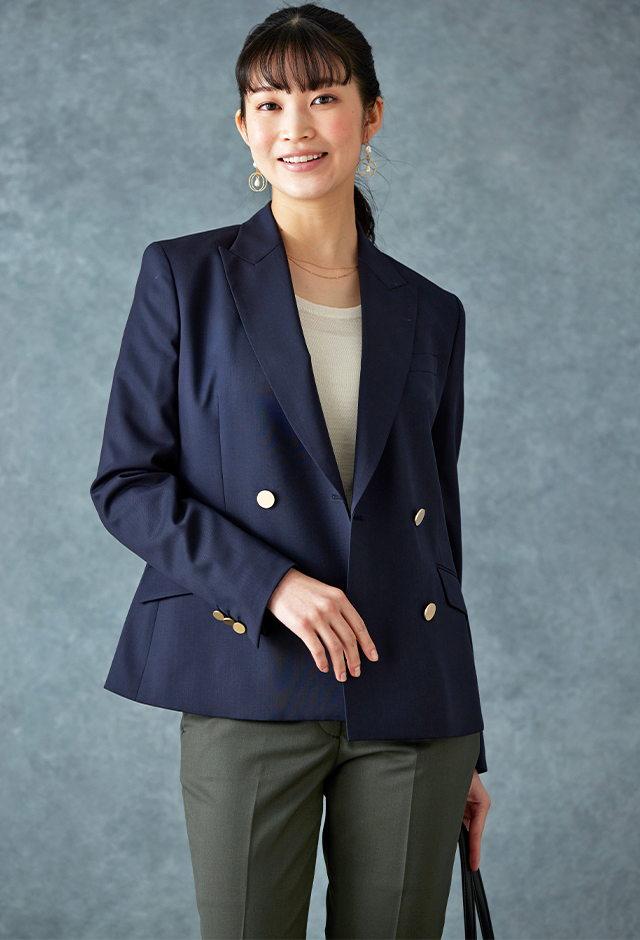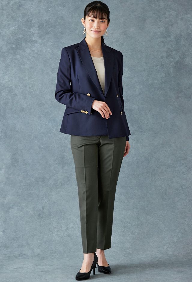 防シワ性やストレッチ性に優れ、出張・外回りの際にも美しいシルエットと着心地を実現できるオリジナルブランド「トラベルウール」で仕立てたスーツです。着回し力抜群のダークネイビースタイルで、オールシーズン着用していただけます。女性らしい優美なラインを演出しながら、スマートな雰囲気を出せるダブルジャケットで仕立てました。ゴールドのボタンが上品なアクセントとなり、クラシカルで洗練された雰囲気を演出。カーキのパンツを合わせることでこなれた印象に。