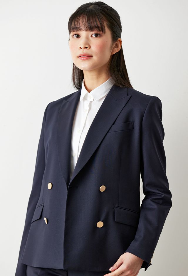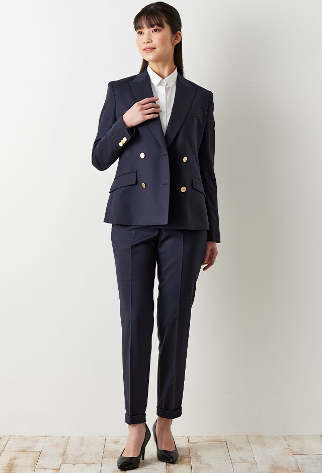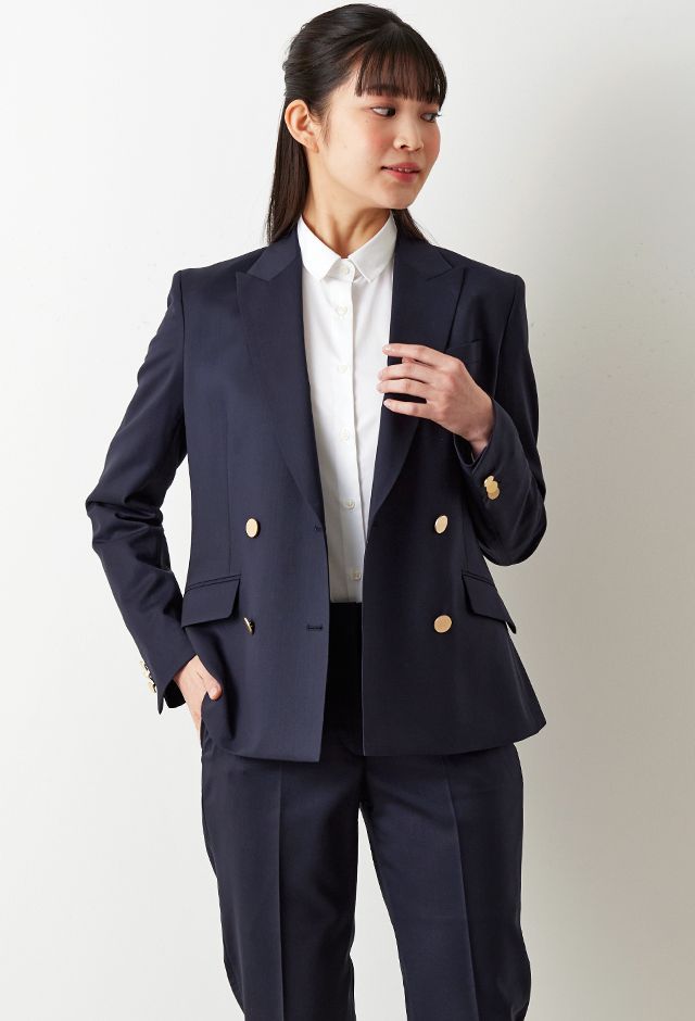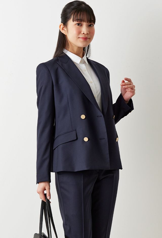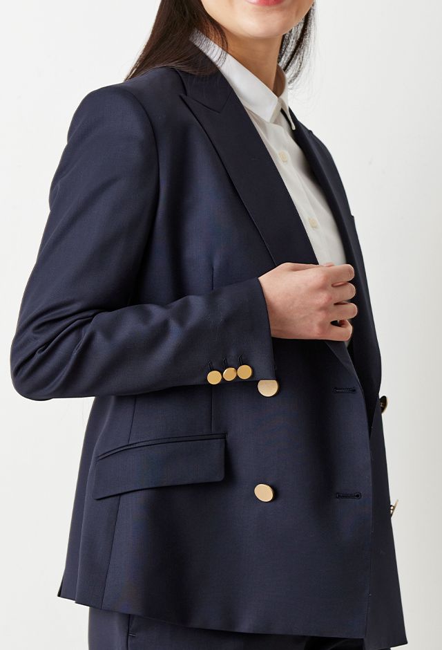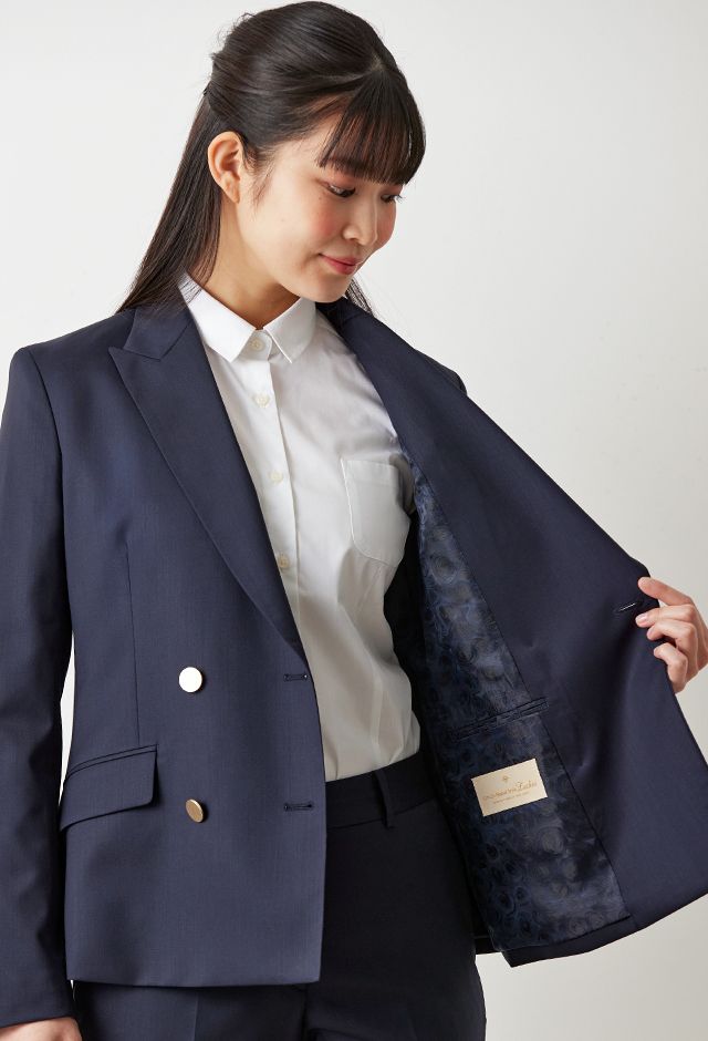 防シワ性やストレッチ性に優れ、出張・外回りの際にも美しいシルエットと着心地を実現できるオリジナルブランド「トラベルウール」で仕立てたスーツです。人気のダークネイビーにしっとりとした生地感のスタイルで、オールシーズン着用していただけます。女性らしい優美なラインを演出しながら、スマートな雰囲気を出せるダブルジャケットで仕立てました。高級感のある優美なネイビーのバラ柄裏地を採用。特徴的なピークドラペルで存在感をプラスしました。いつものビジネスシーンに取り入れやすい1着に◎